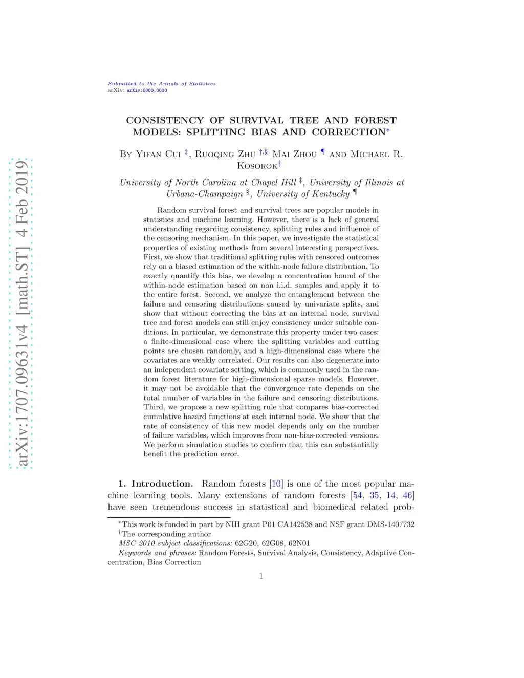 Random survival forest and survival trees are popular models in statistics and machine learning. However, there is a lack of general understanding regarding consistency, splitting rules and influence of the censoring mechanism. In this paper, we investigate the statistical properties of existing methods from several interesting perspectives. First, we show that traditional splitting rules with censored outcomes rely on a biased estimation of the within-node failure distribution. To exactly quantify this bias, we develop a concentration bound of the within-node estimation based on non i.i.d. samples and apply it to the entire forest. Second, we analyze the entanglement between the failure and censoring distributions caused by univariate splits, and show that without correcting the bias at an internal node, survival tree and forest models can still enjoy consistency under suitable conditions. In particular, we demonstrate this property under two cases: a finite-dimensional case where the splitting variables and cutting points are chosen randomly, and a high-dimensional case where the covariates are weakly correlated. Our results can also degenerate into an independent covariate setting, which is commonly used in the random forest literature for high-dimensional sparse models. However, it may not be avoidable that the convergence rate depends on the total number of variables in the failure and censoring distributions. Third, we propose a new splitting rule that compares bias-corrected cumulative hazard functions at each internal node. We show that the rate of consistency of this new model depends only on the number of failure variables, which improves from non-bias-corrected versions. We perform simulation studies to confirm that this can substantially benefit the prediction error.