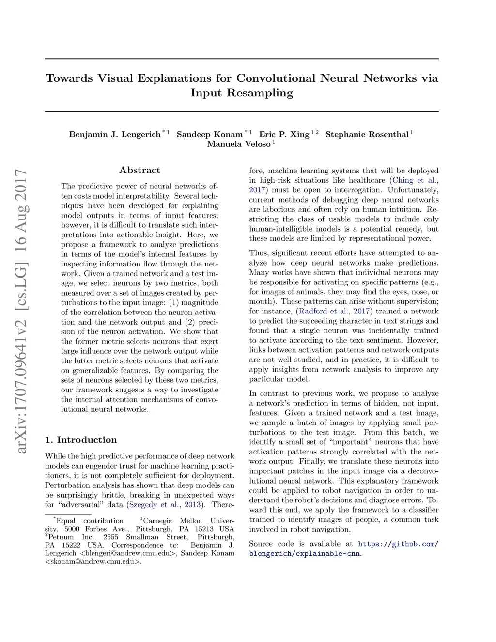 The predictive power of neural networks often costs model interpretability. Several techniques have been developed for explaining model outputs in terms of input features; however, it is difficult to translate such interpretations into actionable insight. Here, we propose a framework to analyze predictions in terms of the model's internal features by inspecting information flow through the network. Given a trained network and a test image, we select neurons by two metrics, both measured over a set of images created by perturbations to the input image: (1) magnitude of the correlation between the neuron activation and the network output and (2) precision of the neuron activation. We show that the former metric selects neurons that exert large influence over the network output while the latter metric selects neurons that activate on generalizable features. By comparing the sets of neurons selected by these two metrics, our framework suggests a way to investigate the internal attention mechanisms of convolutional neural networks.