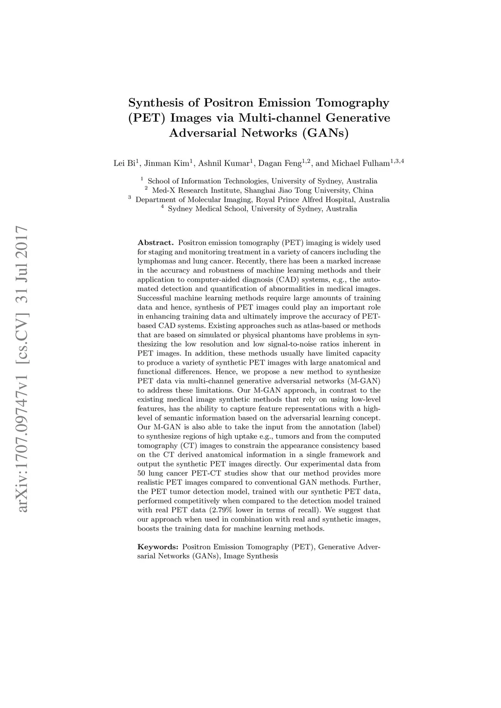 Synthesis of Positron Emission Tomography (PET) Images via Multi-channel