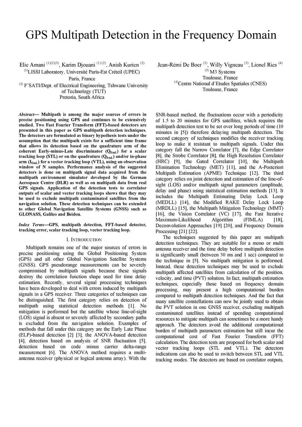 Multipath is among the major sources of errors in precise positioning using GPS and continues to be extensively studied. Two Fast Fourier Transform (FFT)-based detectors are presented in this paper as GPS multipath detection techniques. The detectors are formulated as binary hypothesis tests under the assumption that the multipath exists for a sufficient time frame that allows its detection based on the quadrature arm of the coherent Early-minus-Late discriminator (Q EmL) for a scalar tracking loop (STL) or on the quadrature (Q EmL) and/or in-phase arm (I EmL) for a vector tracking loop (VTL), using an observation window of N samples. Performance analysis of the suggested detectors is done on multipath signal data acquired from the multipath environment simulator developed by the German Aerospace Centre (DLR) as well as on multipath data from real GPS signals. Application of the detection tests to correlator outputs of scalar and vector tracking loops shows that they may be used to exclude multipath contaminated satellites from the navigation solution. These detection techniques can be extended to other Global Navigation Satellite Systems (GNSS) such as GLONASS, Galileo and Beidou.
