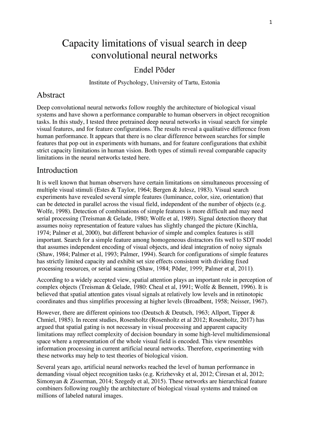 Deep convolutional neural networks follow roughly the architecture of biological visual systems and have shown a performance comparable to human observers in object recognition tasks. In this study, I tested three pretrained deep neural networks in visual search for simple visual features, and for feature configurations. The results reveal a qualitative difference from human performance. It appears that there is no clear difference between searches for simple features that pop out in experiments with humans, and for feature configurations that exhibit strict capacity limitations in human vision. Both types of stimuli reveal comparable capacity limitations in the neural networks tested here.