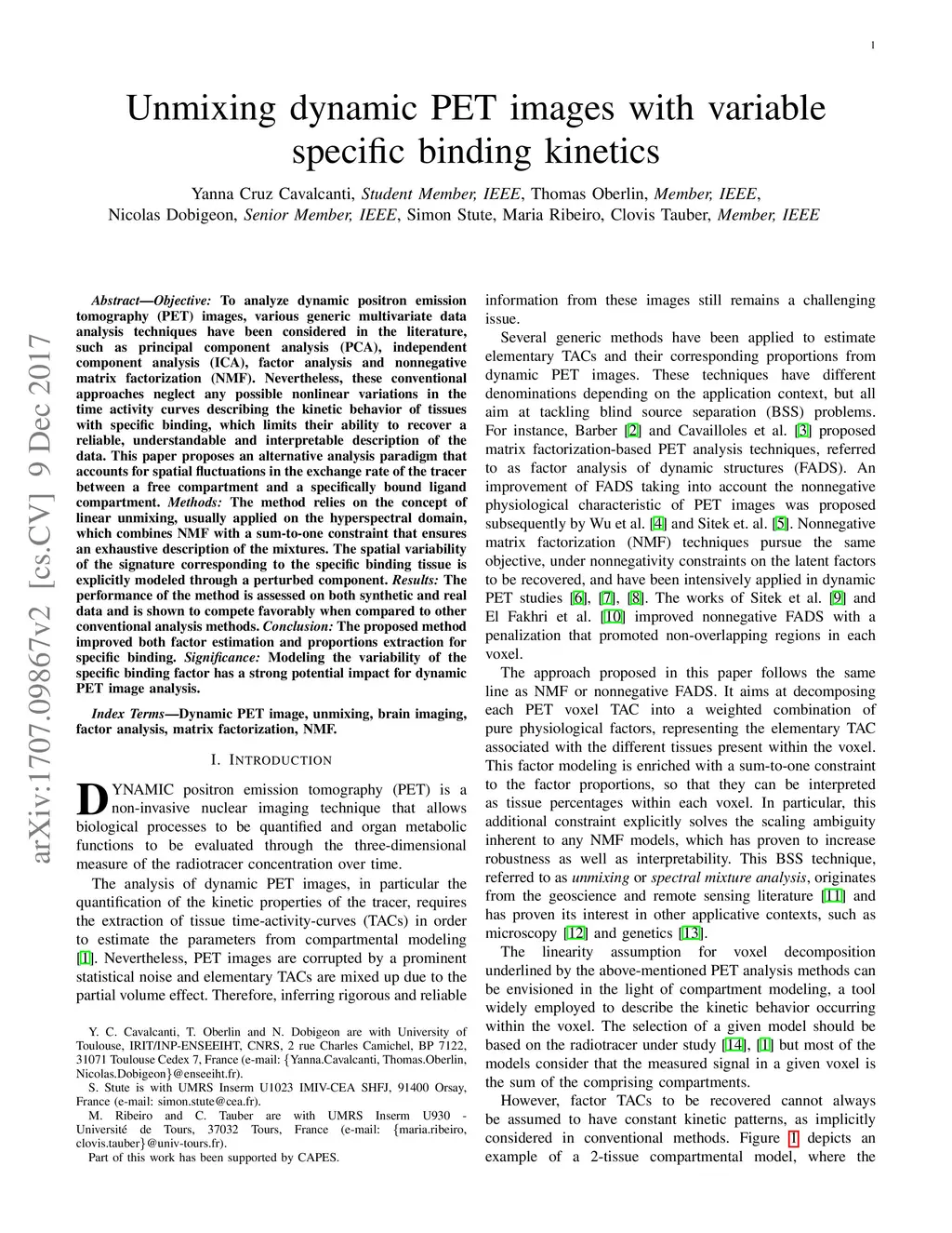 To analyze dynamic positron emission tomography (PET) images, various generic multivariate data analysis techniques have been considered in the literature, such as principal component analysis (PCA), independent component analysis (ICA), factor analysis and nonnegative matrix factorization (NMF). Nevertheless, these conventional approaches neglect any possible nonlinear variations in the time activity curves describing the kinetic behavior of tissues with specific binding, which limits their ability to recover a reliable, understandable and interpretable description of the data. This paper proposes an alternative analysis paradigm that accounts for spatial fluctuations in the exchange rate of the tracer between a free compartment and a specifically bound ligand compartment. The method relies on the concept of linear unmixing, usually applied on the hyperspectral domain, which combines NMF with a sum-to-one constraint that ensures an exhaustive description of the mixtures. The spatial variability of the signature corresponding to the specific binding tissue is explicitly modeled through a perturbed component. The performance of the method is assessed on both synthetic and real data and is shown to compete favorably when compared to other conventional analysis methods. The proposed method improved both factor estimation and proportions extraction for specific binding. Modeling the variability of the specific binding factor has a strong potential impact for dynamic PET image analysis.
