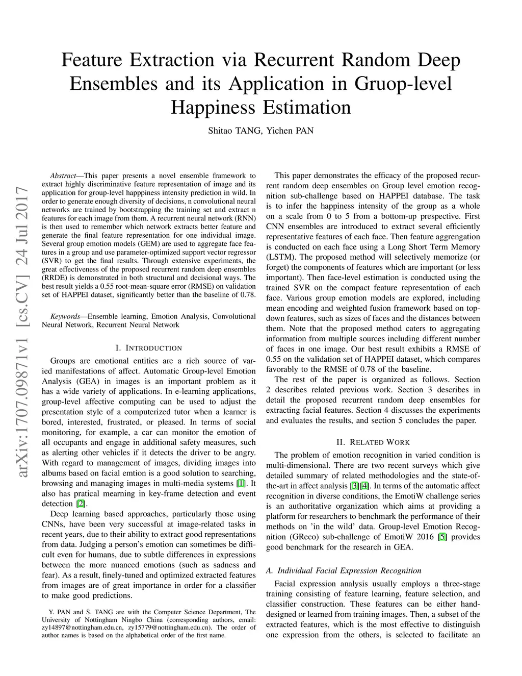 This paper presents a novel ensemble framework to extract highly discriminative feature representation of image and its application for group-level happpiness intensity prediction in wild. In order to generate enough diversity of decisions, n convolutional neural networks are trained by bootstrapping the training set and extract n features for each image from them. A recurrent neural network (RNN) is then used to remember which network extracts better feature and generate the final feature representation for one individual image. Several group emotion models (GEM) are used to aggregate face fea- tures in a group and use parameter-optimized support vector regressor (SVR) to get the final results. Through extensive experiments, the great effectiveness of the proposed recurrent random deep ensembles (RRDE) is demonstrated in both structural and decisional ways. The best result yields a 0.55 root-mean-square error (RMSE) on validation set of HAPPEI dataset, significantly better than the baseline of 0.78.