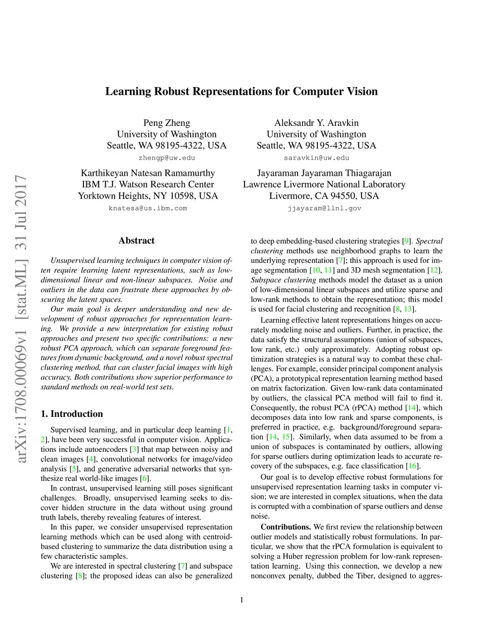 Unsupervised learning techniques in computer vision often require learning latent representations, such as low-dimensional linear and non-linear subspaces. Noise and outliers in the data can frustrate these approaches by obscuring the latent spaces. Our main goal is deeper understanding and new development of robust approaches for representation learning. We provide a new interpretation for existing robust approaches and present two specific contributions: a new robust PCA approach, which can separate foreground features from dynamic background, and a novel robust spectral clustering method, that can cluster facial images with high accuracy. Both contributions show superior performance to standard methods on real-world test sets.