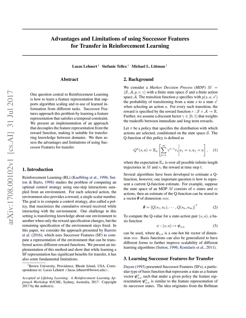 One question central to Reinforcement Learning is how to learn a feature representation that supports algorithm scaling and re-use of learned information from different tasks. Successor Features approach this problem by learning a feature representation that satisfies a temporal constraint. We present an implementation of an approach that decouples the feature representation from the reward function, making it suitable for transferring knowledge between domains. We then assess the advantages and limitations of using Successor Features for transfer.