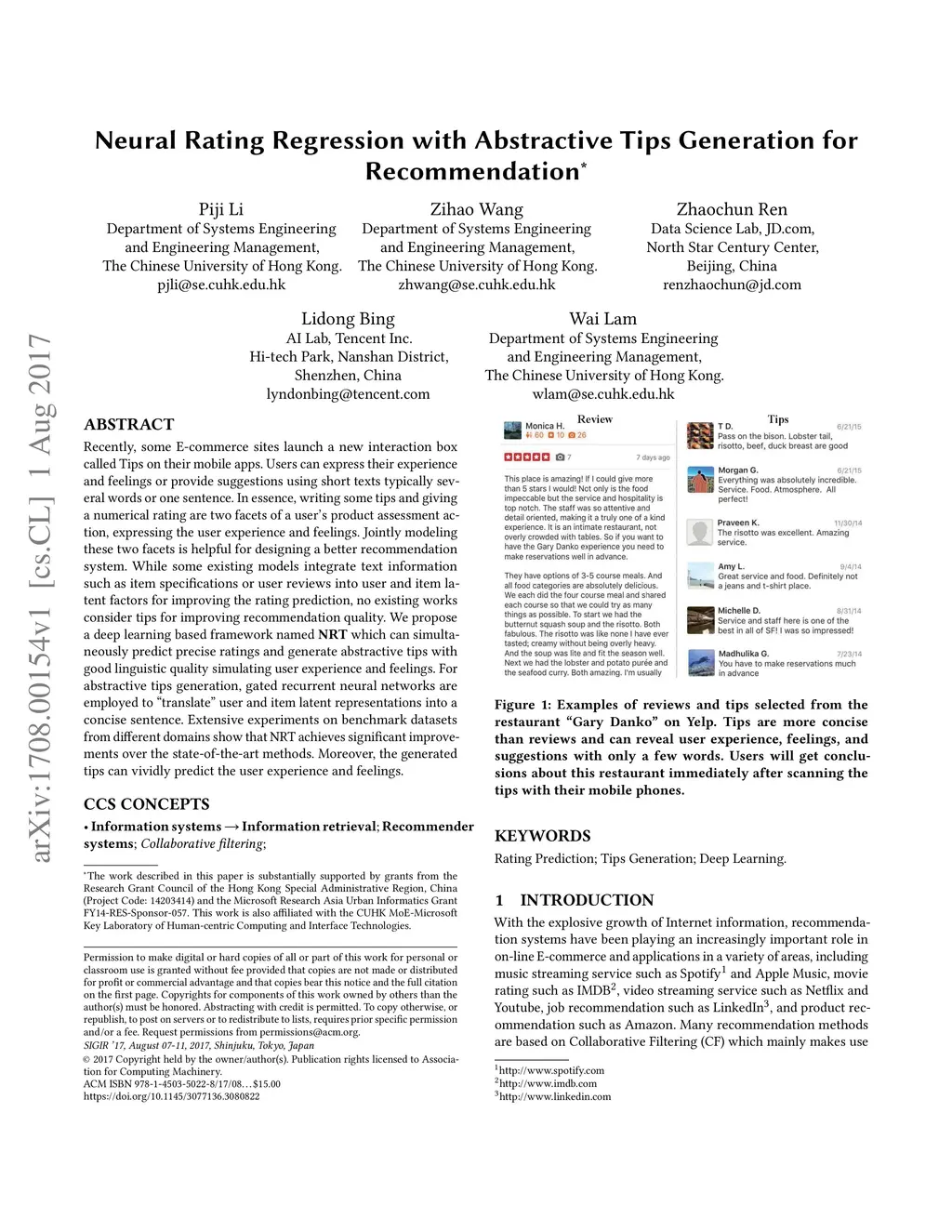 Recently, some E-commerce sites launch a new interaction box called Tips on their mobile apps. Users can express their experience and feelings or provide suggestions using short texts typically several words or one sentence. In essence, writing some tips and giving a numerical rating are two facets of a user's product assessment action, expressing the user experience and feelings. Jointly modeling these two facets is helpful for designing a better recommendation system. While some existing models integrate text information such as item specifications or user reviews into user and item latent factors for improving the rating prediction, no existing works consider tips for improving recommendation quality. We propose a deep learning based framework named NRT which can simultaneously predict precise ratings and generate abstractive tips with good linguistic quality simulating user experience and feelings. For abstractive tips generation, gated recurrent neural networks are employed to "translate" user and item latent representations into a concise sentence. Extensive experiments on benchmark datasets from different domains show that NRT achieves significant improvements over the state-of-the-art methods. Moreover, the generated tips can vividly predict the user experience and feelings.