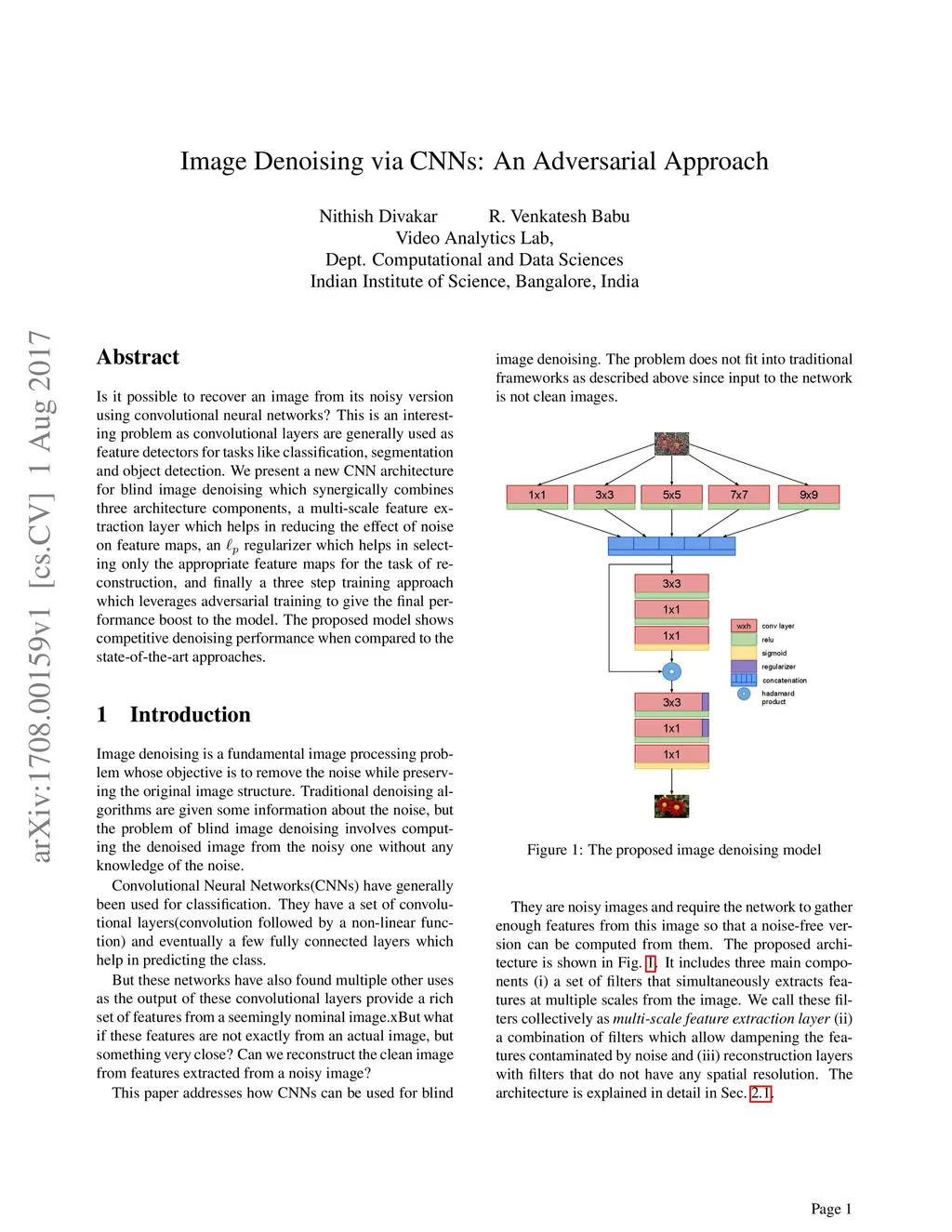 Is it possible to recover an image from its noisy version using convolutional neural networks? This is an interesting problem as convolutional layers are generally used as feature detectors for tasks like classification, segmentation and object detection. We present a new CNN architecture for blind image denoising which synergically combines three architecture components, a multi-scale feature extraction layer which helps in reducing the effect of noise on feature maps, an l_p regularizer which helps in selecting only the appropriate feature maps for the task of reconstruction, and finally a three step training approach which leverages adversarial training to give the final performance boost to the model. The proposed model shows competitive denoising performance when compared to the state-of-the-art approaches.