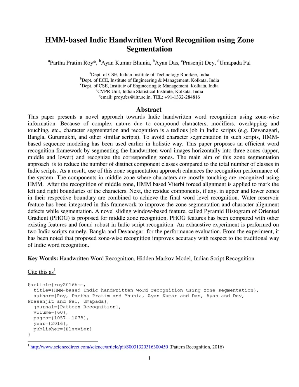 HMM-based Indic Handwritten Word Recognition using Zone Segmentation