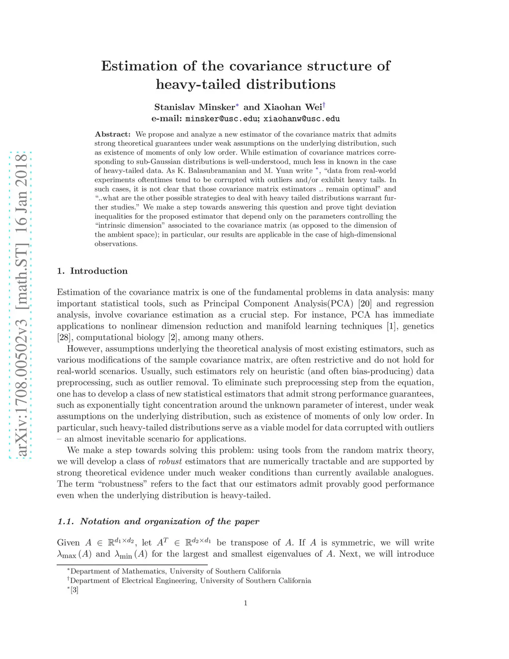 We propose and analyze a new estimator of the covariance matrix that admits strong theoretical guarantees under weak assumptions on the underlying distribution, such as existence of moments of only low order. While estimation of covariance matrices corresponding to sub-Gaussian distributions is well-understood, much less in known in the case of heavy-tailed data. As K. Balasubramanian and M. Yuan write, "data from real-world experiments oftentimes tend to be corrupted with outliers and/or exhibit heavy tails. In such cases, it is not clear that those covariance matrix estimators .. remain optimal" and "..what are the other possible strategies to deal with heavy tailed distributions warrant further studies." We make a step towards answering this question and prove tight deviation inequalities for the proposed estimator that depend only on the parameters controlling the "intrinsic dimension" associated to the covariance matrix (as opposed to the dimension of the ambient space); in particular, our results are applicable in the case of high-dimensional observations.