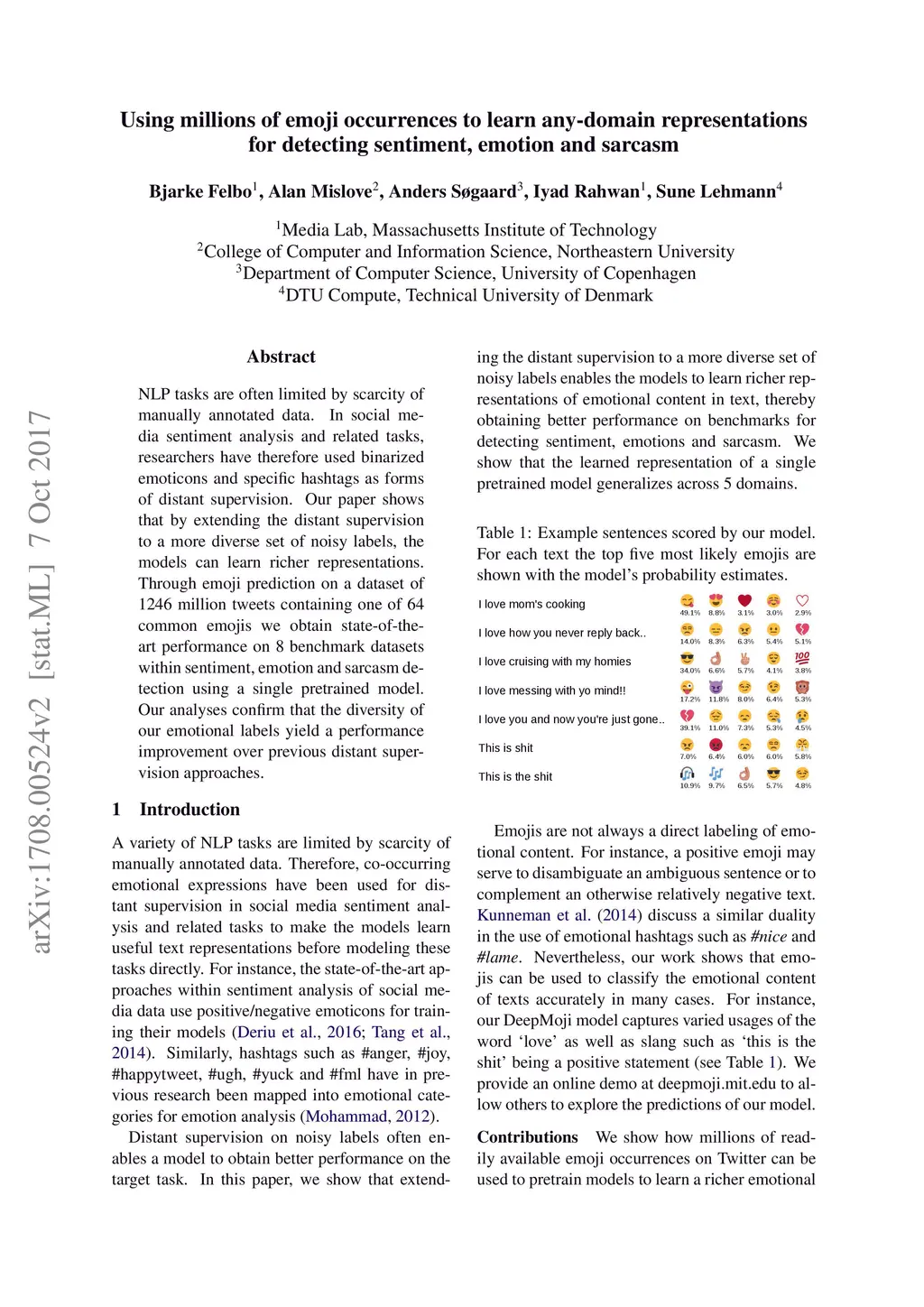 NLP tasks are often limited by scarcity of manually annotated data. In social media sentiment analysis and related tasks, researchers have therefore used binarized emoticons and specific hashtags as forms of distant supervision. Our paper shows that by extending the distant supervision to a more diverse set of noisy labels, the models can learn richer representations. Through emoji prediction on a dataset of 1246 million tweets containing one of 64 common emojis we obtain state-of-the-art performance on 8 benchmark datasets within sentiment, emotion and sarcasm detection using a single pretrained model. Our analyses confirm that the diversity of our emotional labels yield a performance improvement over previous distant supervision approaches.