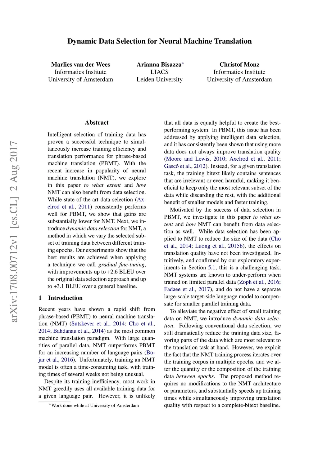 Intelligent selection of training data has proven a successful technique to simultaneously increase training efficiency and translation performance for phrase-based machine translation (PBMT). With the recent increase in popularity of neural machine translation (NMT), we explore in this paper to what extent and how NMT can also benefit from data selection. While state-of-the-art data selection (Axelrod et al., 2011) consistently performs well for PBMT, we show that gains are substantially lower for NMT. Next, we introduce dynamic data selection for NMT, a method in which we vary the selected subset of training data between different training epochs. Our experiments show that the best results are achieved when applying a technique we call gradual fine-tuning, with improvements up to +2.6 BLEU over the original data selection approach and up to +3.1 BLEU over a general baseline.