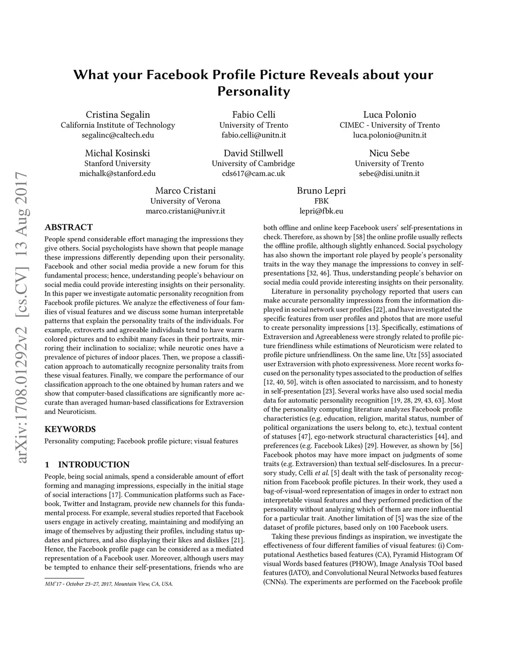 People spend considerable effort managing the impressions they give others. Social psychologists have shown that people manage these impressions differently depending upon their personality. Facebook and other social media provide a new forum for this fundamental process; hence, understanding people's behaviour on social media could provide interesting insights on their personality. In this paper we investigate automatic personality recognition from Facebook profile pictures. We analyze the effectiveness of four families of visual features and we discuss some human interpretable patterns that explain the personality traits of the individuals. For example, extroverts and agreeable individuals tend to have warm colored pictures and to exhibit many faces in their portraits, mirroring their inclination to socialize; while neurotic ones have a prevalence of pictures of indoor places. Then, we propose a classification approach to automatically recognize personality traits from these visual features. Finally, we compare the performance of our classification approach to the one obtained by human raters and we show that computer-based classifications are significantly more accurate than averaged human-based classifications for Extraversion and Neuroticism.