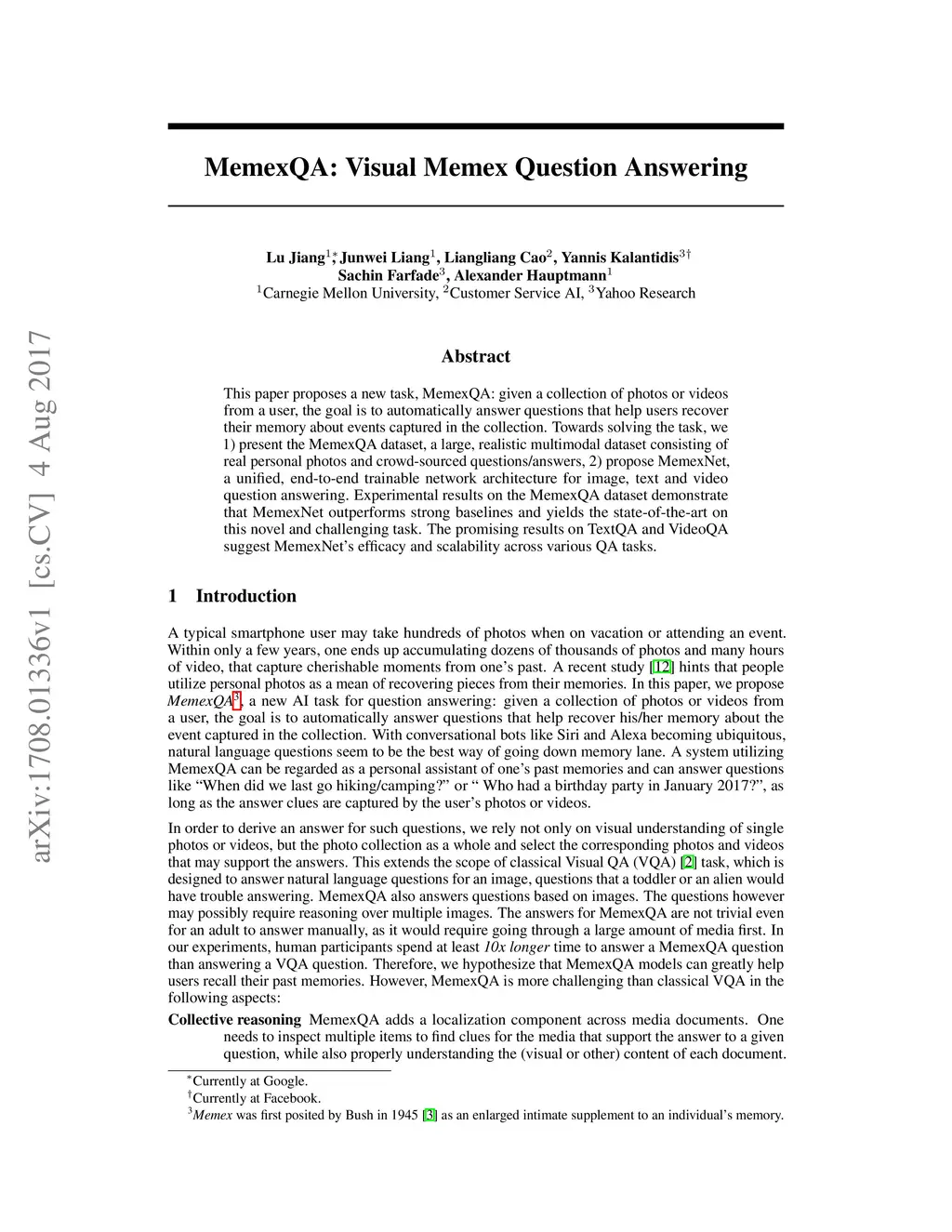 This paper proposes a new task, MemexQA: given a collection of photos or videos from a user, the goal is to automatically answer questions that help users recover their memory about events captured in the collection. Towards solving the task, we 1) present the MemexQA dataset, a large, realistic multimodal dataset consisting of real personal photos and crowd-sourced questions/answers, 2) propose MemexNet, a unified, end-to-end trainable network architecture for image, text and video question answering. Experimental results on the MemexQA dataset demonstrate that MemexNet outperforms strong baselines and yields the state-of-the-art on this novel and challenging task. The promising results on TextQA and VideoQA suggest MemexNet's efficacy and scalability across various QA tasks.
