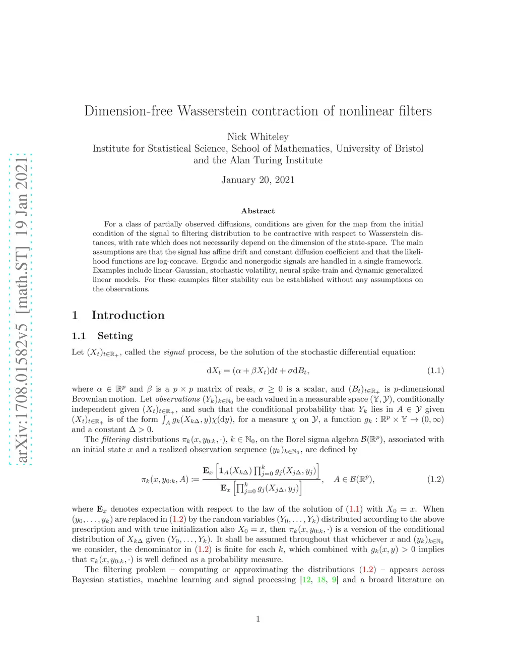 For a class of partially observed diffusions, conditions are given for the map from the initial condition of the signal to filtering distribution to be contractive with respect to Wasserstein distances, with rate which does not necessarily depend on the dimension of the state-space. The main assumptions are that the signal has affine drift and constant diffusion coefficient and that the likelihood functions are log-concave. Ergodic and nonergodic signals are handled in a single framework. Examples include linear-Gaussian, stochastic volatility, neural spike-train and dynamic generalized linear models. For these examples filter stability can be established without any assumptions on the observations.