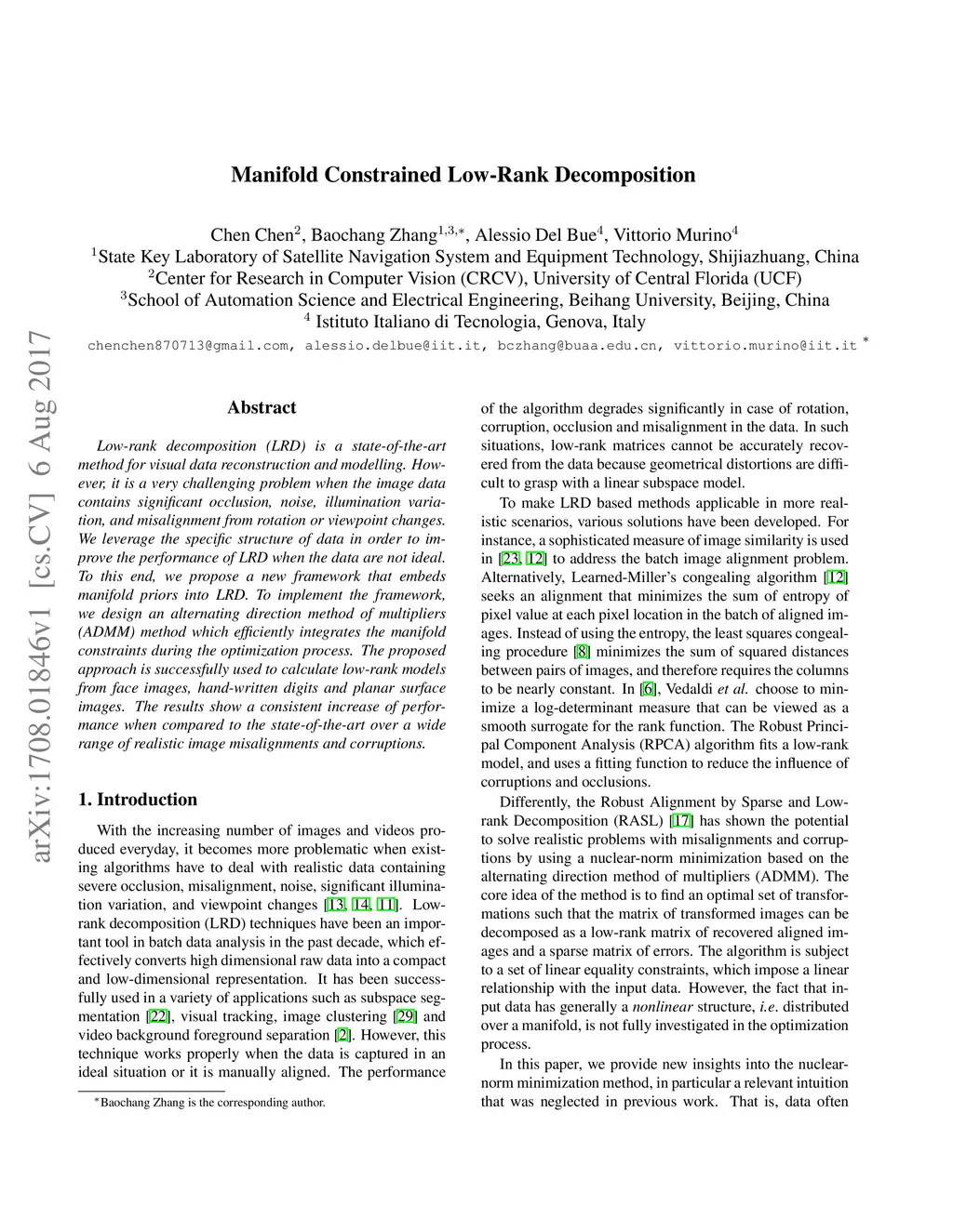 Low-rank decomposition (LRD) is a state-of-the-art method for visual data reconstruction and modelling. However, it is a very challenging problem when the image data contains significant occlusion, noise, illumination variation, and misalignment from rotation or viewpoint changes. We leverage the specific structure of data in order to improve the performance of LRD when the data are not ideal. To this end, we propose a new framework that embeds manifold priors into LRD. To implement the framework, we design an alternating direction method of multipliers (ADMM) method which efficiently integrates the manifold constraints during the optimization process. The proposed approach is successfully used to calculate low-rank models from face images, hand-written digits and planar surface images. The results show a consistent increase of performance when compared to the state-of-the-art over a wide range of realistic image misalignments and corruptions.
