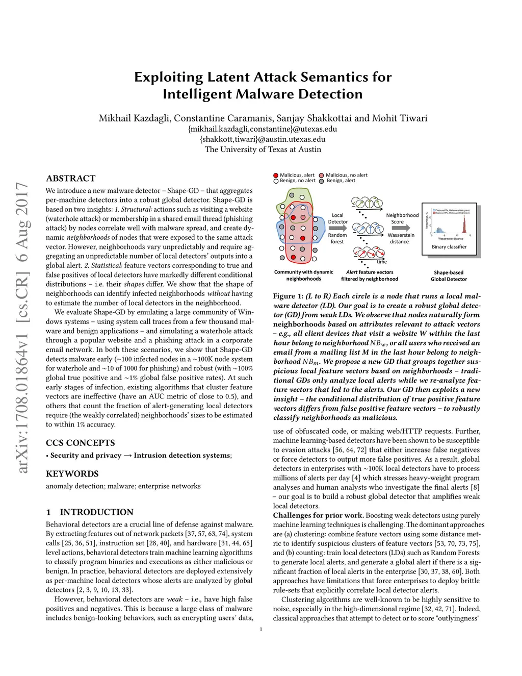 Behavioral malware detectors promise to expose previously unknown malware and are an important security primitive. However, even the best behavioral detectors suffer from high false positives and negatives. In this paper, we address the challenge of aggregating weak per-device behavioral detectors in noisy communities (i.e., ones that produce alerts at unpredictable rates) into an accurate and robust global anomaly detector (GD). Our system - Shape GD - combines two insights: Structural: actions such as visiting a website (waterhole attack) or membership in a shared email thread (phishing attack) by nodes correlate well with malware spread, and create dynamic neighborhoods of nodes that were exposed to the same attack vector; and Statistical: feature vectors corresponding to true and false positives of local detectors have markedly different conditional distributions. We use neighborhoods to amplify the transient low-dimensional structure that is latent in high-dimensional feature vectors - but neighborhoods vary unpredictably, and we use shape to extract robust neighborhood-level features that identify infected neighborhoods. Unlike prior works that aggregate local detectors' alert bitstreams or cluster the feature vectors, Shape GD analyzes the feature vectors that led to local alerts (alert-FVs) to separate true and false positives. Shape GD first filters these alert-FVs into neighborhoods and efficiently maps a neighborhood's alert-FVs' statistical shapes into a scalar score. Shape GD then acts as a neighborhood level anomaly detector - training on benign program traces to learn the ShapeScore of false positive neighborhoods, and classifying neighborhoods with anomalous ShapeScores as malicious. Shape GD detects malware early (~100 infected nodes in a ~100K node system for waterhole and ~10 of 1000 for phishing) and robustly (with ~100% global TP and ~1% global FP rates).