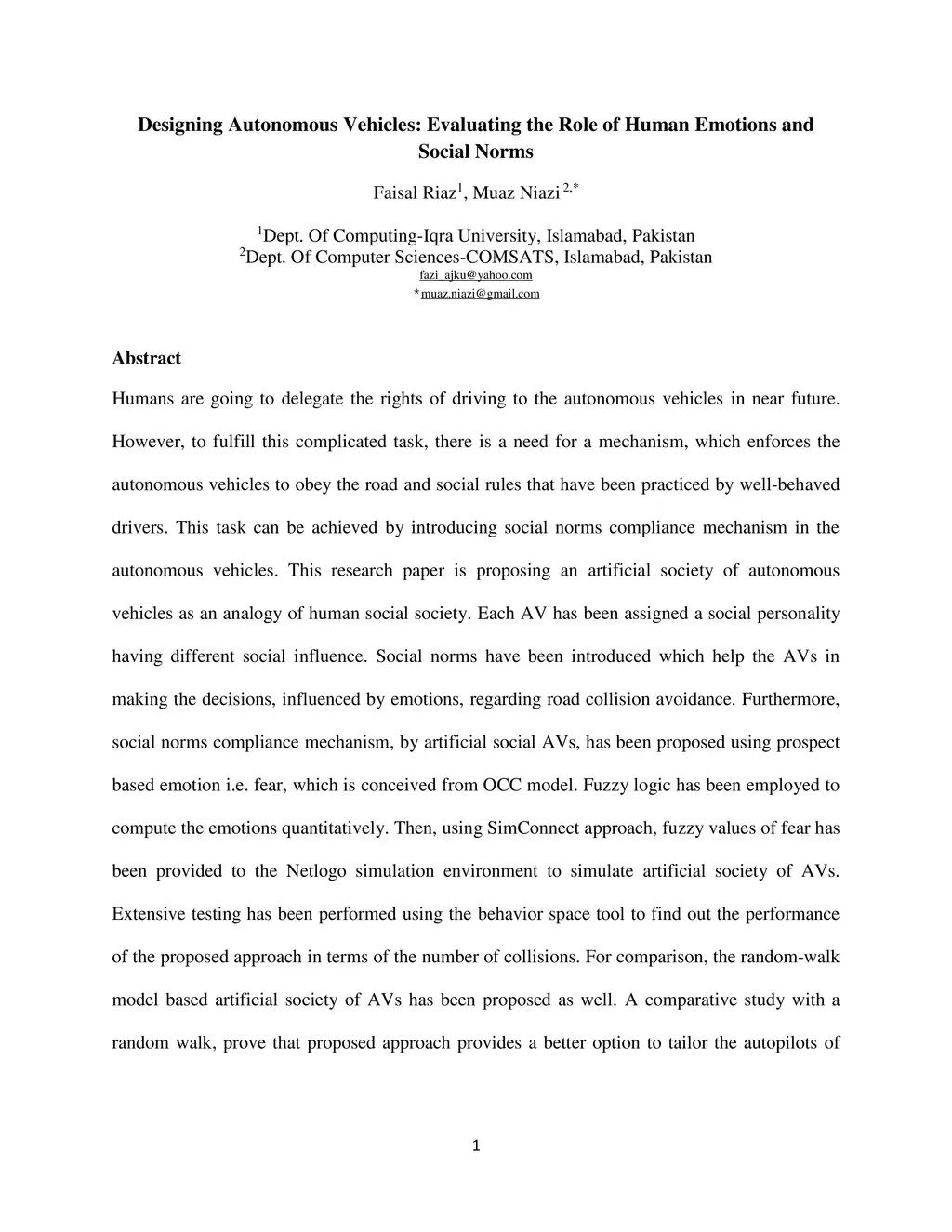Humans are going to delegate the rights of driving to the autonomous vehicles in near future. However, to fulfill this complicated task, there is a need for a mechanism, which enforces the autonomous vehicles to obey the road and social rules that have been practiced by well-behaved drivers. This task can be achieved by introducing social norms compliance mechanism in the autonomous vehicles. This research paper is proposing an artificial society of autonomous vehicles as an analogy of human social society. Each AV has been assigned a social personality having different social influence. Social norms have been introduced which help the AVs in making the decisions, influenced by emotions, regarding road collision avoidance. Furthermore, social norms compliance mechanism, by artificial social AVs, has been proposed using prospect based emotion i.e. fear, which is conceived from OCC model. Fuzzy logic has been employed to compute the emotions quantitatively. Then, using SimConnect approach, fuzzy values of fear has been provided to the Netlogo simulation environment to simulate artificial society of AVs. Extensive testing has been performed using the behavior space tool to find out the performance of the proposed approach in terms of the number of collisions. For comparison, the random-walk model based artificial society of AVs has been proposed as well. A comparative study with a random walk, prove that proposed approach provides a better option to tailor the autopilots of future AVS, Which will be more socially acceptable and trustworthy by their riders in terms of safe road travel.