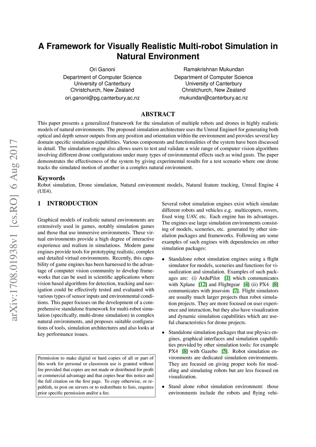This paper presents a generalized framework for the simulation of multiple robots and drones in highly realistic models of natural environments. The proposed simulation architecture uses the Unreal Engine4 for generating both optical and depth sensor outputs from any position and orientation within the environment and provides several key domain specific simulation capabilities. Various components and functionalities of the system have been discussed in detail. The simulation engine also allows users to test and validate a wide range of computer vision algorithms involving different drone configurations under many types of environmental effects such as wind gusts. The paper demonstrates the effectiveness of the system by giving experimental results for a test scenario where one drone tracks the simulated motion of another in a complex natural environment.