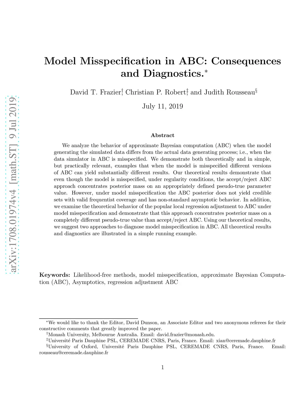 We analyze the behavior of approximate Bayesian computation (ABC) when the model generating the simulated data differs from the actual data generating process; i.e., when the data simulator in ABC is misspecified. We demonstrate both theoretically and in simple, but practically relevant, examples that when the model is misspecified different versions of ABC can yield substantially different results. Our theoretical results demonstrate that even though the model is misspecified, under regularity conditions, the accept/reject ABC approach concentrates posterior mass on an appropriately defined pseudo-true parameter value. However, under model misspecification the ABC posterior does not yield credible sets with valid frequentist coverage and has non-standard asymptotic behavior. In addition, we examine the theoretical behavior of the popular local regression adjustment to ABC under model misspecification and demonstrate that this approach concentrates posterior mass on a completely different pseudo-true value than accept/reject ABC. Using our theoretical results, we suggest two approaches to diagnose model misspecification in ABC. All theoretical results and diagnostics are illustrated in a simple running example.
