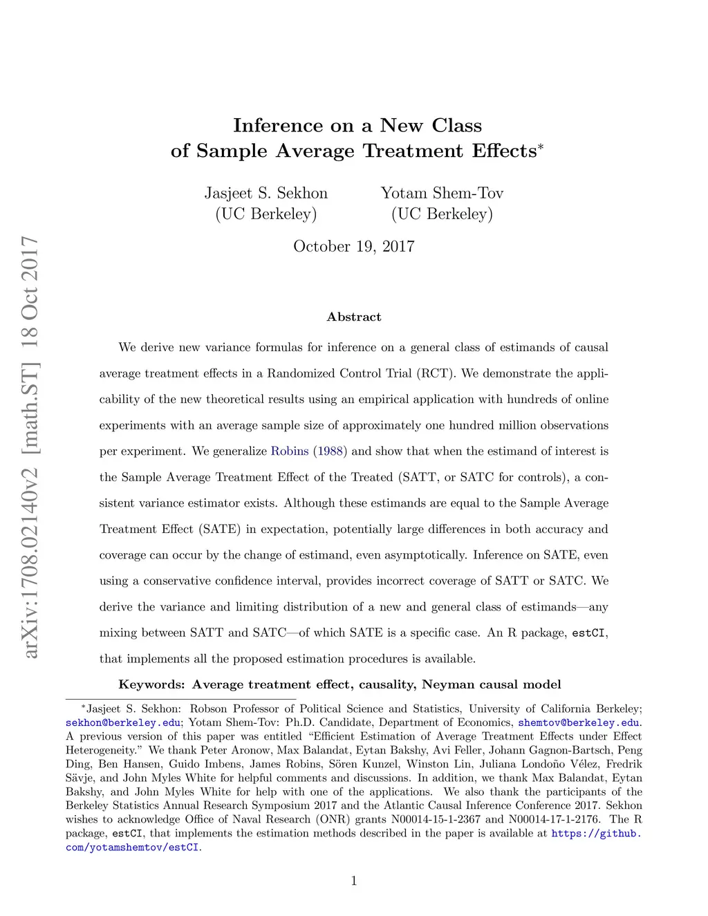 We derive new variance formulas for inference on a general class of estimands of causal average treatment effects in a Randomized Control Trial (RCT). We generalize Robins (1988) and show that when the estimand of interest is the Sample Average Treatment Effect of the Treated (SATT or SATC for controls), a consistent variance estimator exists. Although these estimands are equal to the Sample Average Treatment Effect (SATE) in expectation, potentially large differences in both accuracy and coverage can occur by the change of estimand, even asymptotically. Inference on the SATE, even using a conservative confidence interval, provides incorrect coverage of the SATT or SATC. We derive the variance and limiting distribution of a new and general class of estimands---any mixing between SATT and SATC---for which the SATE is a specific case. We demonstrate the applicability of the new theoretical results using Monte-Carlo simulations and an empirical application with hundreds of online experiments with an average sample size of approximately one hundred million observations per experiment. An R package, estCI, that implements all the proposed estimation procedures is available.