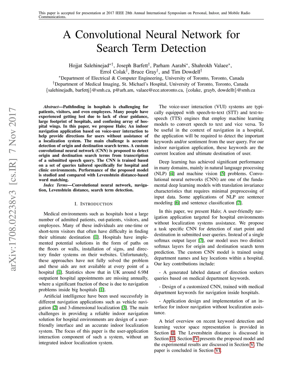 Pathfinding in hospitals is challenging for patients, visitors, and even employees. Many people have experienced getting lost due to lack of clear guidance, large footprint of hospitals, and confusing array of hospital wings. In this paper, we propose Halo; An indoor navigation application based on voice-user interaction to help provide directions for users without assistance of a localization system. The main challenge is accurate detection of origin and destination search terms. A custom convolutional neural network (CNN) is proposed to detect origin and destination search terms from transcription of a submitted speech query. The CNN is trained based on a set of queries tailored specifically for hospital and clinic environments. Performance of the proposed model is studied and compared with Levenshtein distance-based word matching.