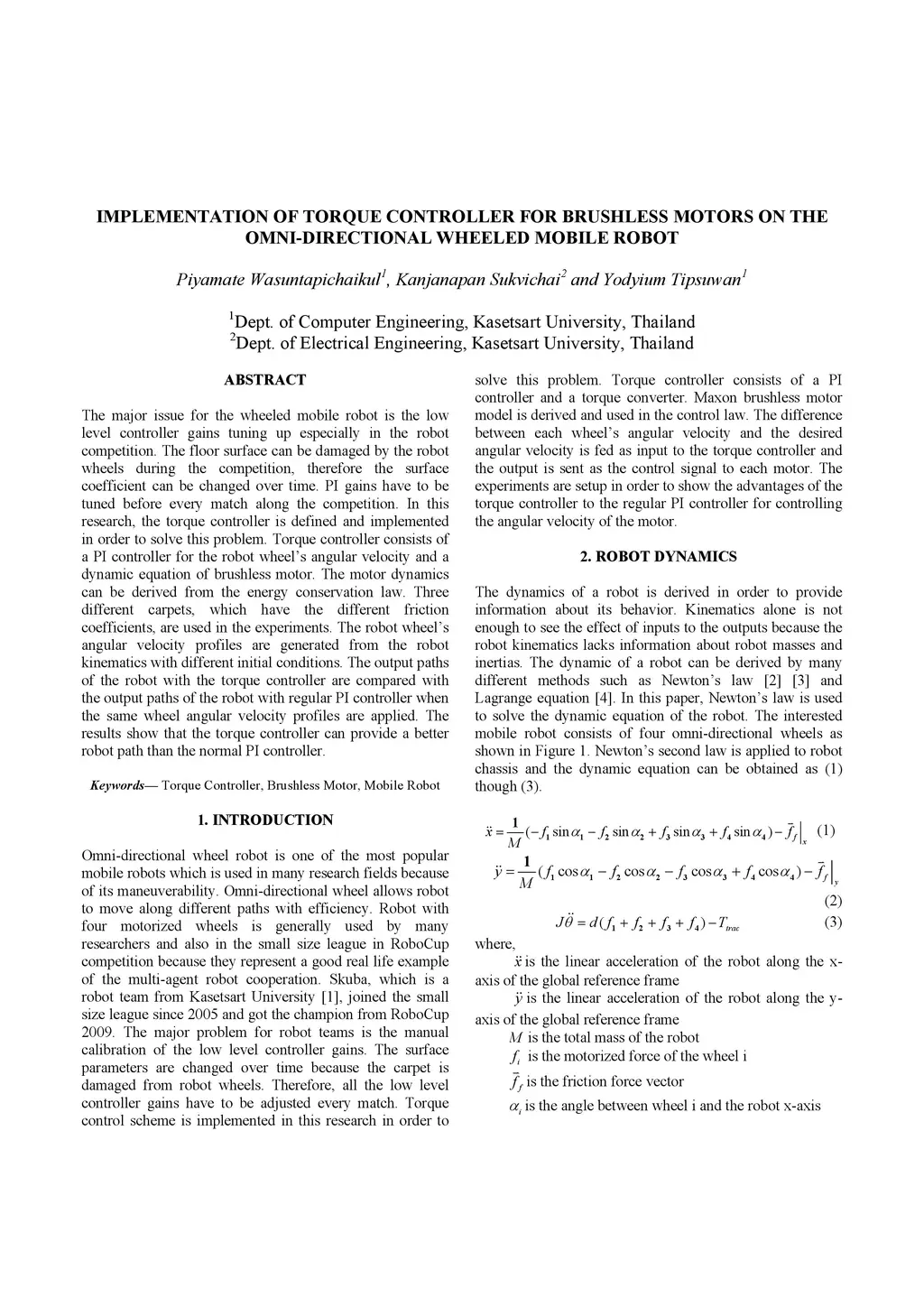 The major issue for the wheeled mobile robot is the low level controller gains tuning up especially in the robot competition. The floor surface can be damaged by the robot wheels during the competition, therefore the surface coefficient can be changed over time. PI gains have to be tuned before every match along the competition. In this research, the torque controller is defined and implemented in order to solve this problem. Torque controller consists of a PI controller for the robot wheel's angular velocity and a dynamic equation of brushless motor. The motor dynamics can be derived from the energy conservation law. Three different carpets, which have the different friction coefficients, are used in the experiments. The robot wheel's angular velocity profiles are generated from the robot kinematics with different initial conditions. The output paths of the robot with the torque controller are compared with the output paths of the robot with regular PI controller when the same wheel angular velocity profiles are applied. The results show that the torque controller can provide a better robot path than the normal PI controller.