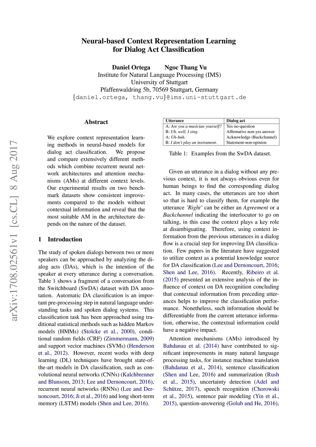 Neural-based Context Representation Learning for Dialog Act