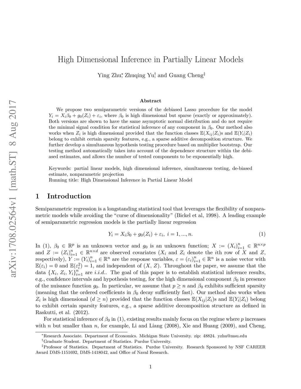 We propose two semiparametric versions of the debiased Lasso procedure for the model , where is high dimensional but sparse (exactly or approximately). Both versions are shown to have the same asymptotic normal distribution and do not require the minimal signal condition for statistical inference of any component in . Our method also works when is high dimensional provided that the function classes s and belong to exhibit certain sparsity features, e.g., a sparse additive decomposition structure. We further develop a simultaneous hypothesis testing procedure based on multiplier bootstrap. Our testing method automatically takes into account of the dependence structure within the debiased estimates, and allows the number of tested components to be exponentially high.