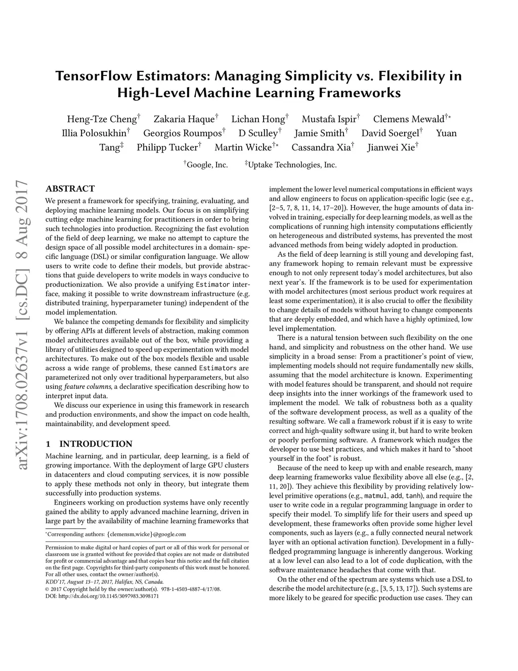 We present a framework for specifying, training, evaluating, and deploying machine learning models. Our focus is on simplifying cutting edge machine learning for practitioners in order to bring such technologies into production. Recognizing the fast evolution of the field of deep learning, we make no attempt to capture the design space of all possible model architectures in a domain- specific language (DSL) or similar configuration language. We allow users to write code to define their models, but provide abstractions that guide develop- ers to write models in ways conducive to productionization. We also provide a unifying Estimator interface, making it possible to write downstream infrastructure (e.g. distributed training, hyperparameter tuning) independent of the model implementation. We balance the competing demands for flexibility and simplicity by offering APIs at different levels of abstraction, making common model architectures available out of the box, while providing a library of utilities designed to speed up experimentation with model architectures. To make out of the box models flexible and usable across a wide range of problems, these canned Estimators are parameterized not only over traditional hyperparameters, but also using feature columns, a declarative specification describing how to interpret input data. We discuss our experience in using this framework in re- search and production environments, and show the impact on code health, maintainability, and development speed.