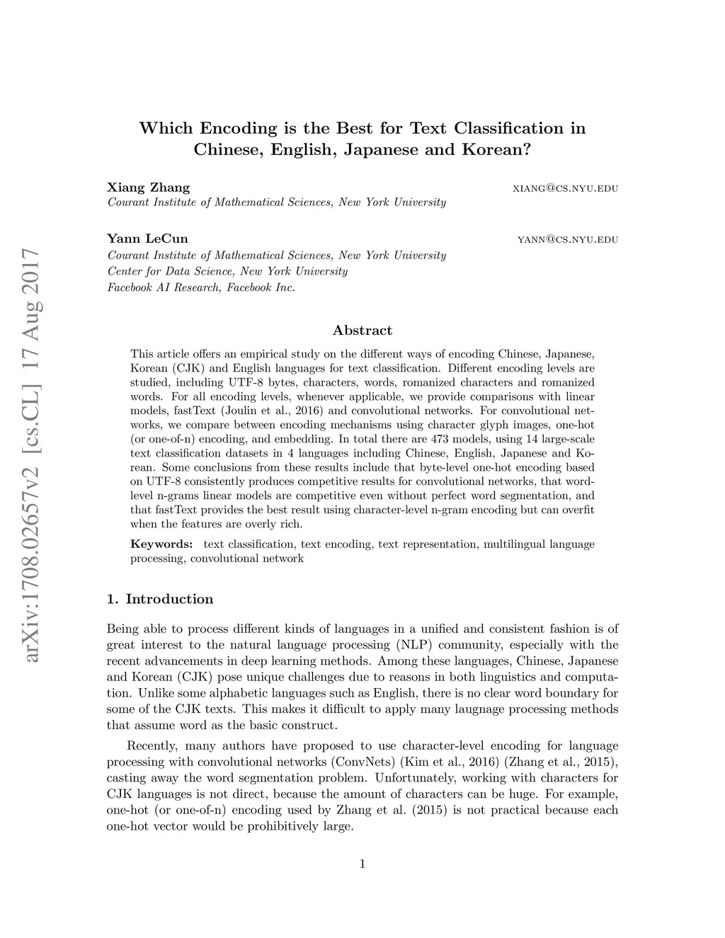 This article offers an empirical study on the different ways of encoding Chinese, Japanese, Korean (CJK) and English languages for text classification. Different encoding levels are studied, including UTF-8 bytes, characters, words, romanized characters and romanized words. For all encoding levels, whenever applicable, we provide comparisons with linear models, fastText and convolutional networks. For convolutional networks, we compare between encoding mechanisms using character glyph images, one-hot (or one-of-n) encoding, and embedding. In total there are 473 models, using 14 large-scale text classification datasets in 4 languages including Chinese, English, Japanese and Korean. Some conclusions from these results include that byte-level one-hot encoding based on UTF-8 consistently produces competitive results for convolutional networks, that word-level n-grams linear models are competitive even without perfect word segmentation, and that fastText provides the best result using character-level n-gram encoding but can overfit when the features are overly rich.