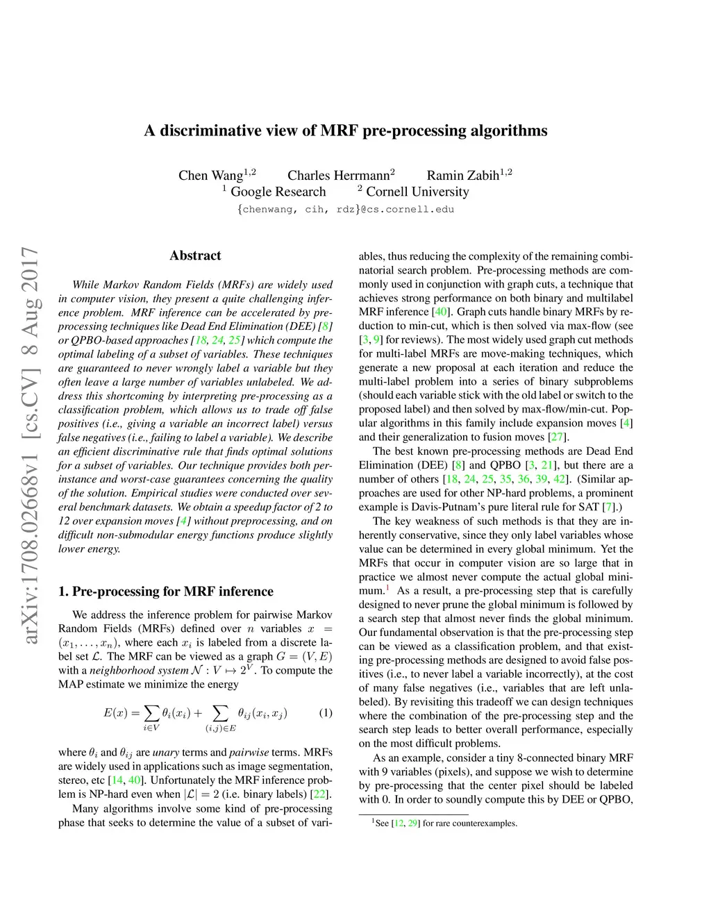 While Markov Random Fields (MRFs) are widely used in computer vision, they present a quite challenging inference problem. MRF inference can be accelerated by pre-processing techniques like Dead End Elimination (DEE) or QPBO-based approaches which compute the optimal labeling of a subset of variables. These techniques are guaranteed to never wrongly label a variable but they often leave a large number of variables unlabeled. We address this shortcoming by interpreting pre-processing as a classification problem, which allows us to trade off false positives (i.e., giving a variable an incorrect label) versus false negatives (i.e., failing to label a variable). We describe an efficient discriminative rule that finds optimal solutions for a subset of variables. Our technique provides both per-instance and worst-case guarantees concerning the quality of the solution. Empirical studies were conducted over several benchmark datasets. We obtain a speedup factor of 2 to 12 over expansion moves without preprocessing, and on difficult non-submodular energy functions produce slightly lower energy.