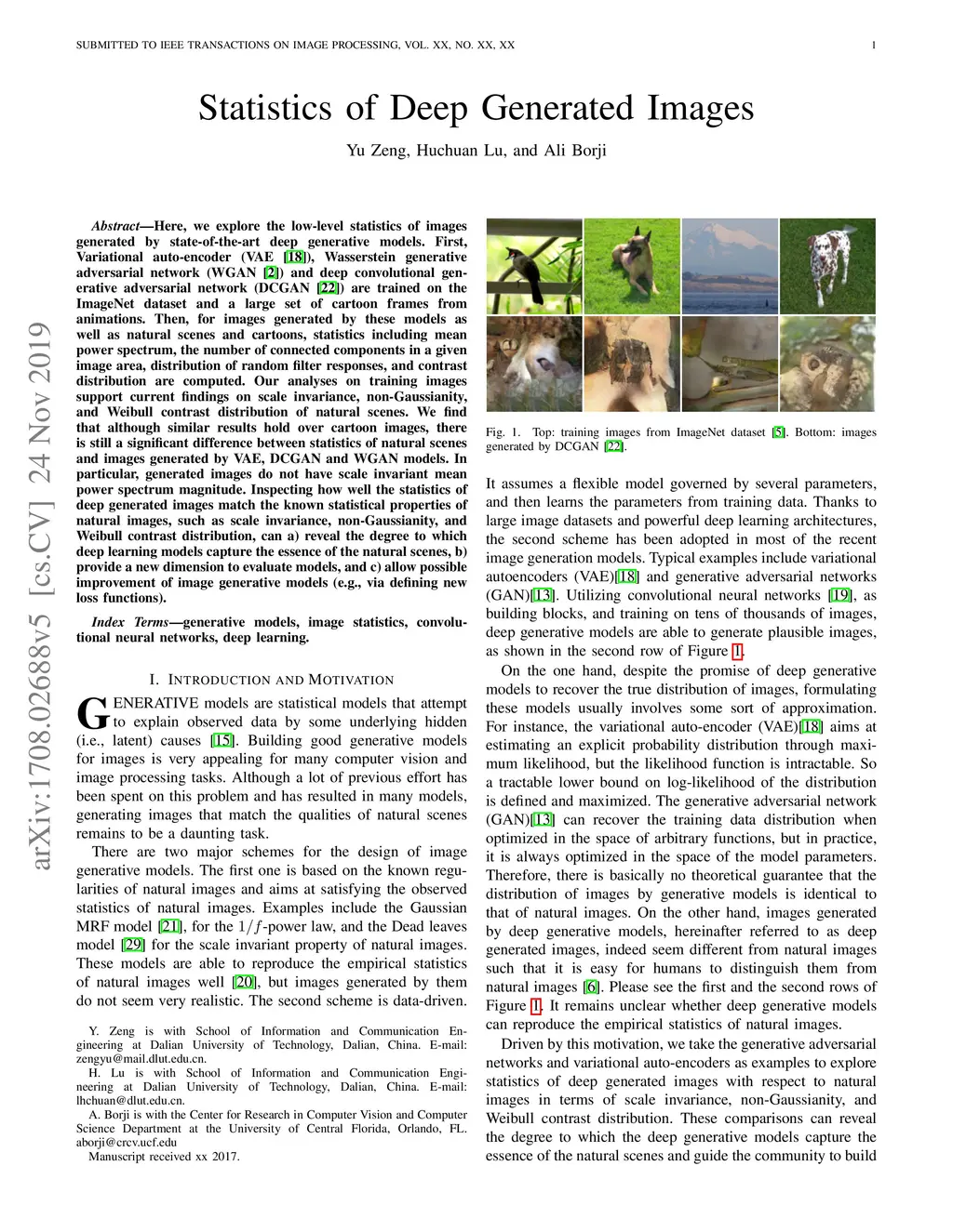 Here, we explore the low-level statistics of images generated by state-of-the-art deep generative models. First, Variational auto-encoder (VAE~\cite{kingma2013auto}), Wasserstein generative adversarial network (WGAN~\cite{arjovsky2017wasserstein}) and deep convolutional generative adversarial network (DCGAN~\cite{radford2015unsupervised}) are trained on the ImageNet dataset and a large set of cartoon frames from animations. Then, for images generated by these models as well as natural scenes and cartoons, statistics including mean power spectrum, the number of connected components in a given image area, distribution of random filter responses, and contrast distribution are computed. Our analyses on training images support current findings on scale invariance, non-Gaussianity, and Weibull contrast distribution of natural scenes. We find that although similar results hold over cartoon images, there is still a significant difference between statistics of natural scenes and images generated by VAE, DCGAN and WGAN models. In particular, generated images do not have scale invariant mean power spectrum magnitude, which indicates existence of extra structures in these images. Inspecting how well the statistics of deep generated images match the known statistical properties of natural images, such as scale invariance, non-Gaussianity, and Weibull contrast distribution, can a) reveal the degree to which deep learning models capture the essence of the natural scenes, b) provide a new dimension to evaluate models, and c) allow possible improvement of image generative models (e.g., via defining new loss functions).
