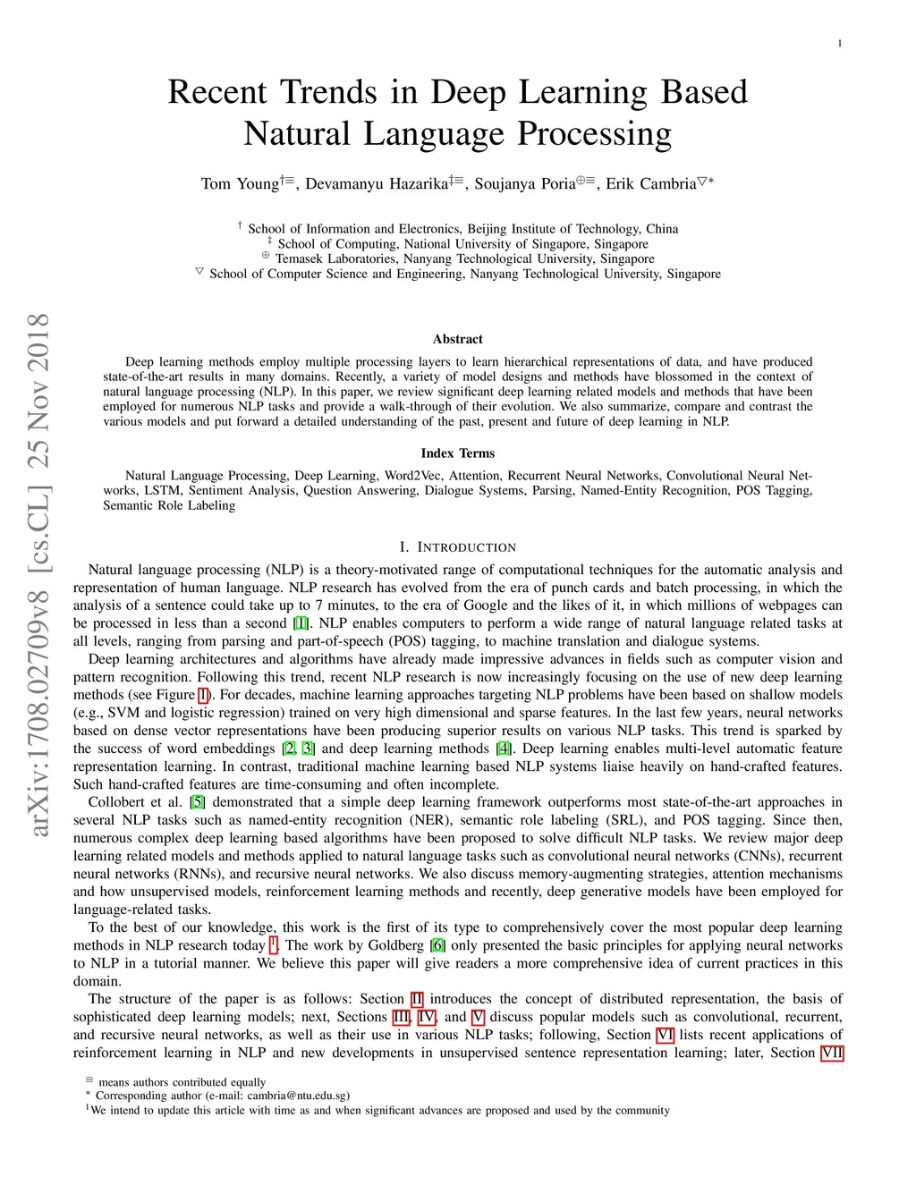 Deep learning methods employ multiple processing layers to learn hierarchical representations of data and have produced state-of-the-art results in many domains. Recently, a variety of model designs and methods have blossomed in the context of natural language processing (NLP). In this paper, we review significant deep learning related models and methods that have been employed for numerous NLP tasks and provide a walk-through of their evolution. We also summarize, compare and contrast the various models and put forward a detailed understanding of the past, present and future of deep learning in NLP.