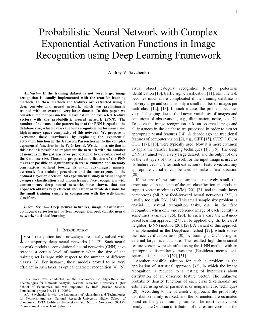 If the training dataset is not very large, image recognition is usually implemented with the transfer learning methods. In these methods the features are extracted using a deep convolutional neural network, which was preliminarily trained with an external very-large dataset. In this paper we consider the nonparametric classification of extracted feature vectors with the probabilistic neural network (PNN). The number of neurons at the pattern layer of the PNN is equal to the database size, which causes the low recognition performance and high memory space complexity of this network. We propose to overcome these drawbacks by replacing the exponential activation function in the Gaussian Parzen kernel to the complex exponential functions in the Fej\ér kernel. We demonstrate that in this case it is possible to implement the network with the number of neurons in the pattern layer proportional to the cubic root of the database size. Thus, the proposed modification of the PNN makes it possible to significantly decrease runtime and memory complexities without loosing its main advantages, namely, extremely fast training procedure and the convergence to the optimal Bayesian decision. An experimental study in visual object category classification and unconstrained face recognition with contemporary deep neural networks have shown, that our approach obtains very efficient and rather accurate decisions for the small training sample in comparison with the well-known classifiers.