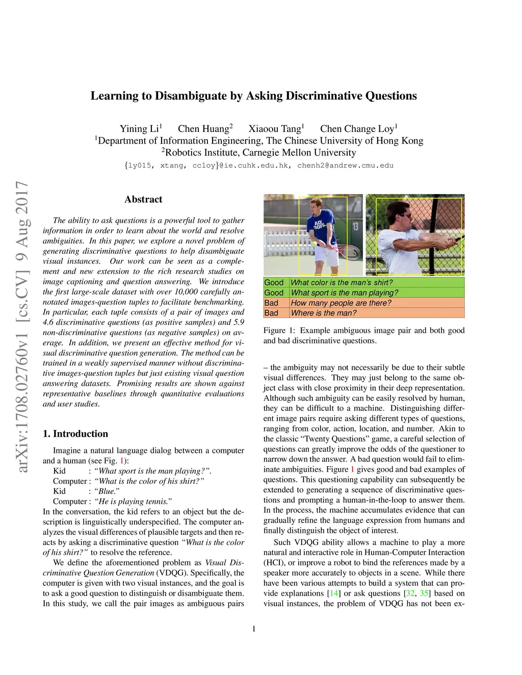 The ability to ask questions is a powerful tool to gather information in order to learn about the world and resolve ambiguities. In this paper, we explore a novel problem of generating discriminative questions to help disambiguate visual instances. Our work can be seen as a complement and new extension to the rich research studies on image captioning and question answering. We introduce the first large-scale dataset with over 10,000 carefully annotated images-question tuples to facilitate benchmarking. In particular, each tuple consists of a pair of images and 4.6 discriminative questions (as positive samples) and 5.9 non-discriminative questions (as negative samples) on average. In addition, we present an effective method for visual discriminative question generation. The method can be trained in a weakly supervised manner without discriminative images-question tuples but just existing visual question answering datasets. Promising results are shown against representative baselines through quantitative evaluations and user studies.