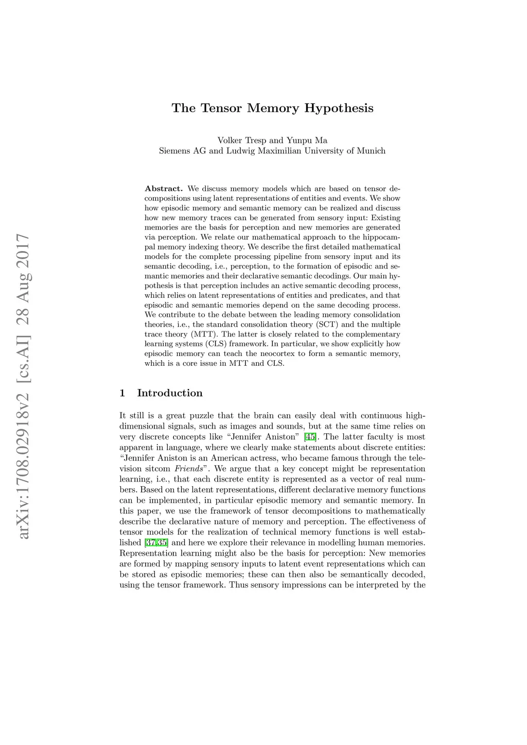 We discuss memory models which are based on tensor decompositions using latent representations of entities and events. We show how episodic memory and semantic memory can be realized and discuss how new memory traces can be generated from sensory input: Existing memories are the basis for perception and new memories are generated via perception. We relate our mathematical approach to the hippocampal memory indexing theory. We describe the first detailed mathematical models for the complete processing pipeline from sensory input and its semantic decoding, i.e., perception, to the formation of episodic and semantic memories and their declarative semantic decodings. Our main hypothesis is that perception includes an active semantic decoding process, which relies on latent representations of entities and predicates, and that episodic and semantic memories depend on the same decoding process. We contribute to the debate between the leading memory consolidation theories, i.e., the standard consolidation theory (SCT) and the multiple trace theory (MTT). The latter is closely related to the complementary learning systems (CLS) framework. In particular, we show explicitly how episodic memory can teach the neocortex to form a semantic memory, which is a core issue in MTT and CLS.