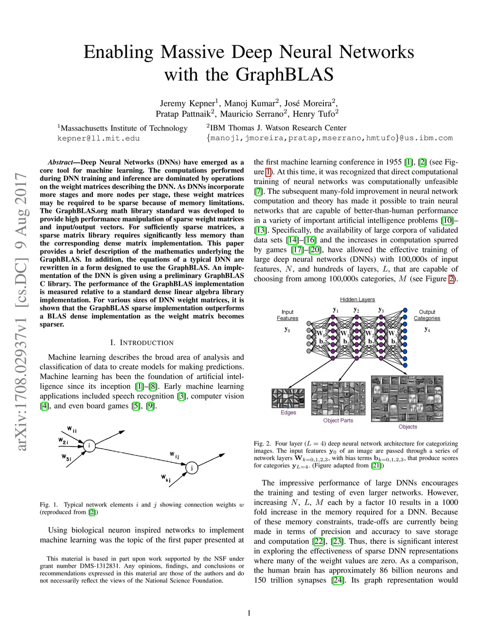 Deep Neural Networks (DNNs) have emerged as a core tool for machine learning. The computations performed during DNN training and inference are dominated by operations on the weight matrices describing the DNN. As DNNs incorporate more stages and more nodes per stage, these weight matrices may be required to be sparse because of memory limitations. The GraphBLAS.org math library standard was developed to provide high performance manipulation of sparse weight matrices and input/output vectors. For sufficiently sparse matrices, a sparse matrix library requires significantly less memory than the corresponding dense matrix implementation. This paper provides a brief description of the mathematics underlying the GraphBLAS. In addition, the equations of a typical DNN are rewritten in a form designed to use the GraphBLAS. An implementation of the DNN is given using a preliminary GraphBLAS C library. The performance of the GraphBLAS implementation is measured relative to a standard dense linear algebra library implementation. For various sizes of DNN weight matrices, it is shown that the GraphBLAS sparse implementation outperforms a BLAS dense implementation as the weight matrix becomes sparser.