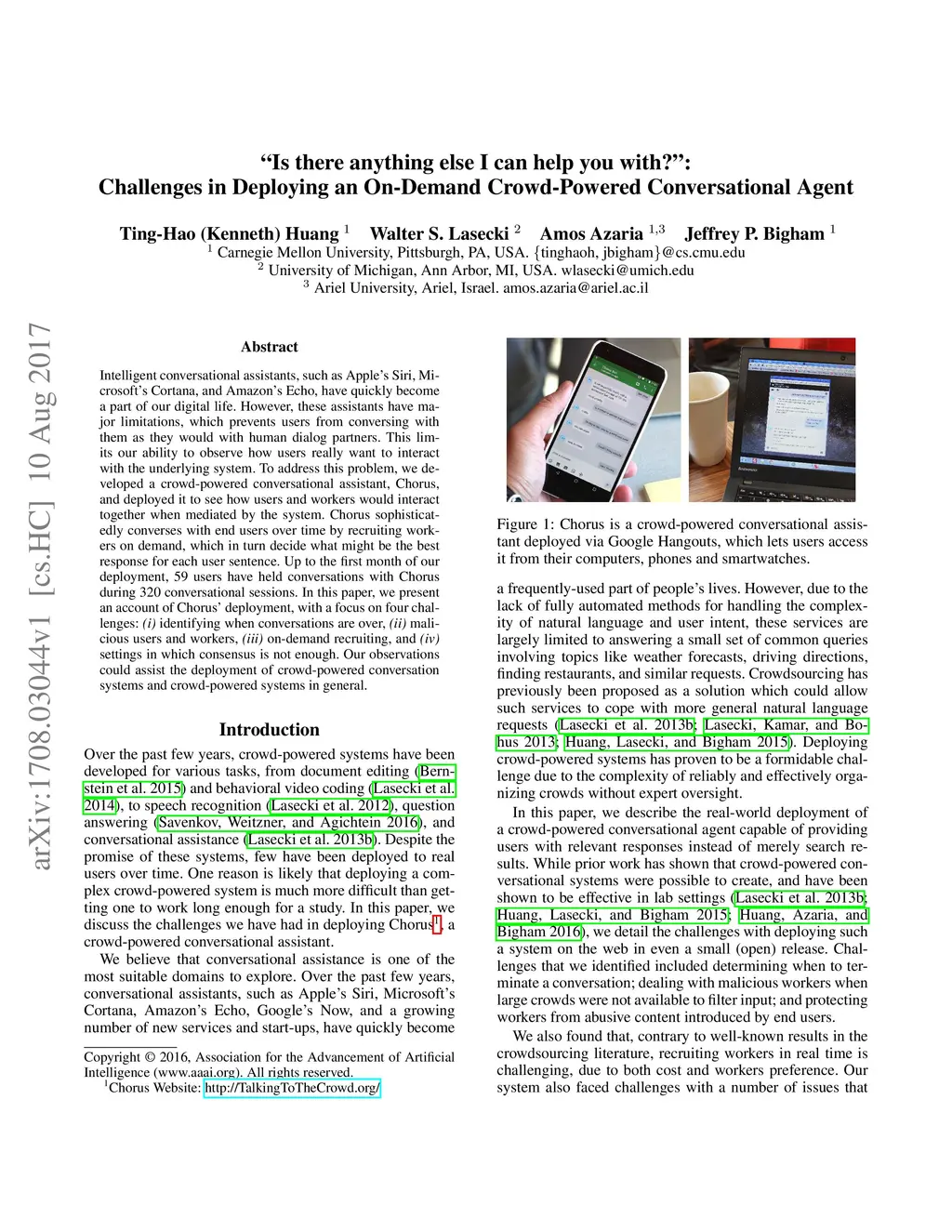 Intelligent conversational assistants, such as Apple's Siri, Microsoft's Cortana, and Amazon's Echo, have quickly become a part of our digital life. However, these assistants have major limitations, which prevents users from conversing with them as they would with human dialog partners. This limits our ability to observe how users really want to interact with the underlying system. To address this problem, we developed a crowd-powered conversational assistant, Chorus, and deployed it to see how users and workers would interact together when mediated by the system. Chorus sophisticatedly converses with end users over time by recruiting workers on demand, which in turn decide what might be the best response for each user sentence. Up to the first month of our deployment, 59 users have held conversations with Chorus during 320 conversational sessions. In this paper, we present an account of Chorus' deployment, with a focus on four challenges: (i) identifying when conversations are over, (ii) malicious users and workers, (iii) on-demand recruiting, and (iv) settings in which consensus is not enough. Our observations could assist the deployment of crowd-powered conversation systems and crowd-powered systems in general.