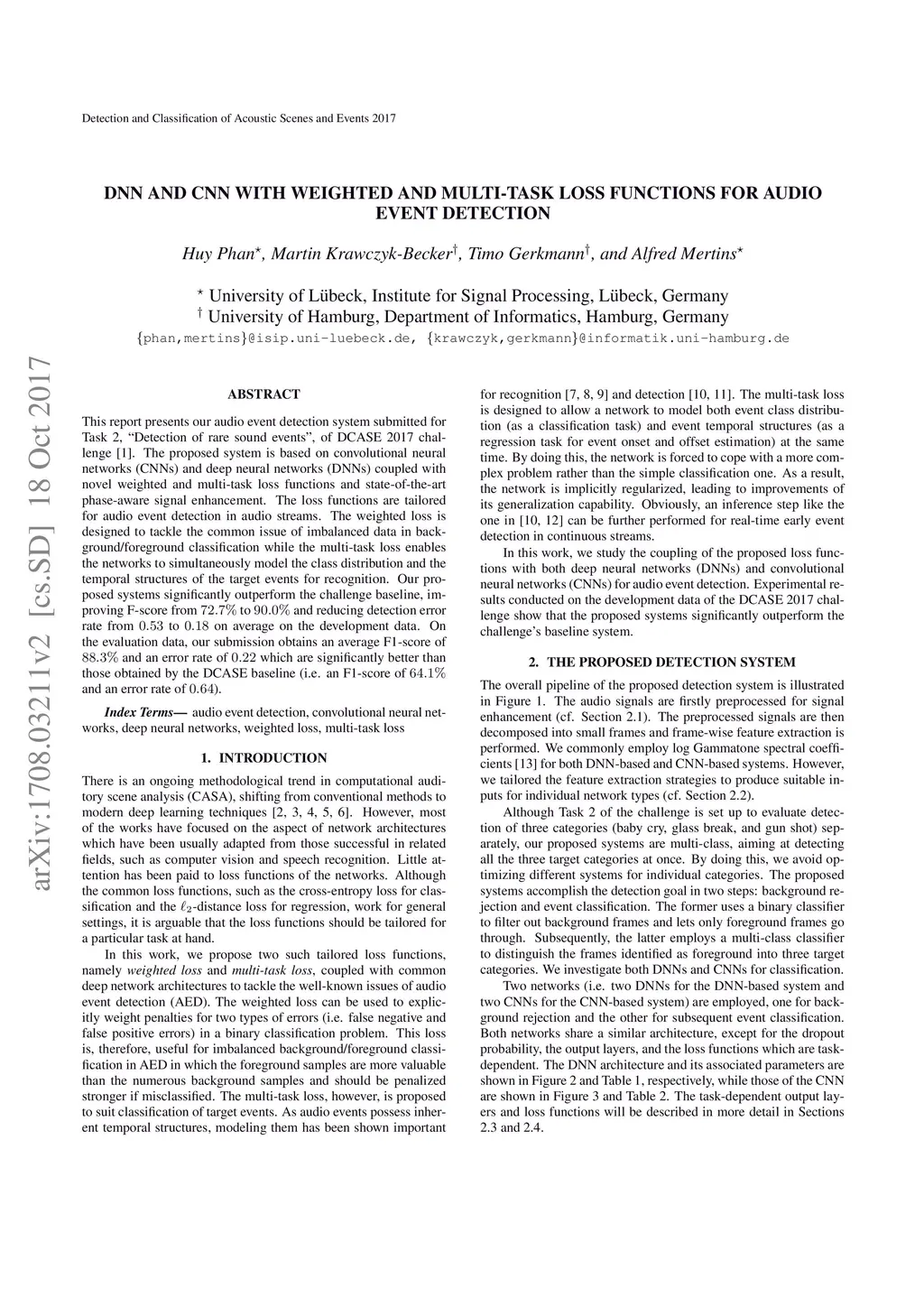 This report presents our audio event detection system submitted for Task 2, "Detection of rare sound events", of DCASE 2017 challenge. The proposed system is based on convolutional neural networks (CNNs) and deep neural networks (DNNs) coupled with novel weighted and multi-task loss functions and state-of-the-art phase-aware signal enhancement. The loss functions are tailored for audio event detection in audio streams. The weighted loss is designed to tackle the common issue of imbalanced data in background/foreground classification while the multi-task loss enables the networks to simultaneously model the class distribution and the temporal structures of the target events for recognition. Our proposed systems significantly outperform the challenge baseline, improving F-score from 72.7% to 90.0% and reducing detection error rate from 0.53 to 0.18 on average on the development data. On the evaluation data, our submission obtains an average F1-score of 88.3% and an error rate of 0.22 which are significantly better than those obtained by the DCASE baseline (i.e. an F1-score of 64.1% and an error rate of 0.64).