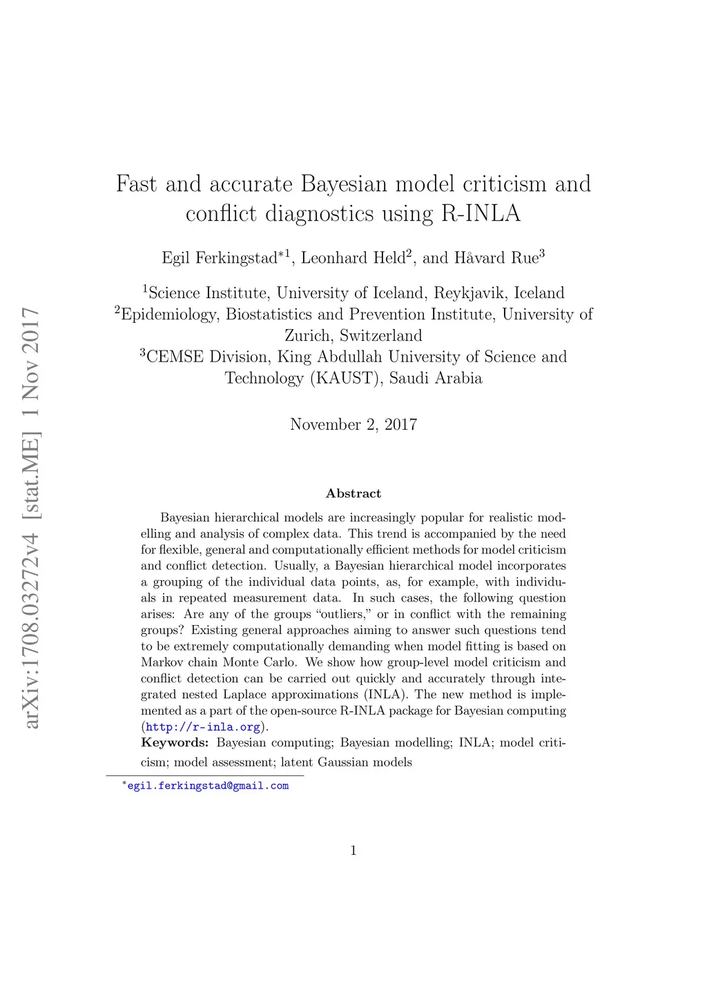 Bayesian hierarchical models are increasingly popular for realistic modelling and analysis of complex data. This trend is accompanied by the need for flexible, general, and computationally efficient methods for model criticism and conflict detection. Usually, a Bayesian hierarchical model incorporates a grouping of the individual data points, for example individuals in repeated measurement data. In such cases, the following question arises: Are any of the groups "outliers", or in conflict with the remaining groups? Existing general approaches aiming to answer such questions tend to be extremely computationally demanding when model fitting is based on MCMC. We show how group-level model criticism and conflict detection can be done quickly and accurately through integrated nested Laplace approximations (INLA). The new method is implemented as a part of the open source R-INLA package for Bayesian computing (http://r-inla.org).