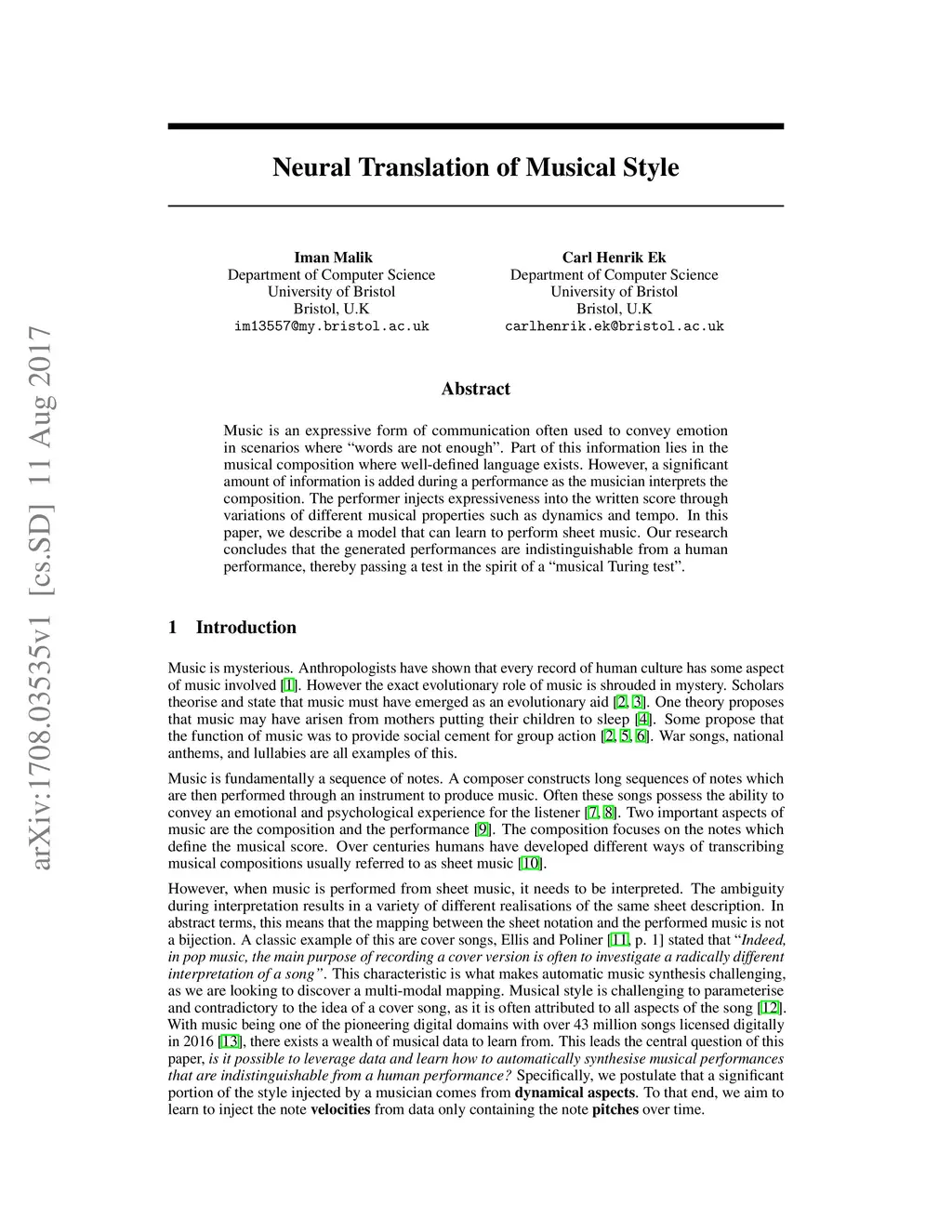 Neural Translation of Musical Style
