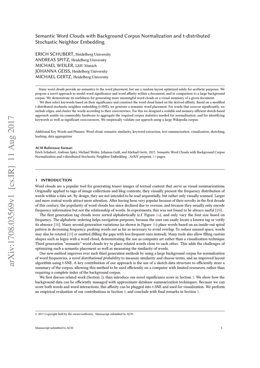Many word clouds provide no semantics to the word placement, but use a random layout optimized solely for aesthetic purposes. We propose a novel approach to model word significance and word affinity within a document, and in comparison to a large background corpus. We demonstrate its usefulness for generating more meaningful word clouds as a visual summary of a given document. We then select keywords based on their significance and construct the word cloud based on the derived affinity. Based on a modified t-distributed stochastic neighbor embedding (t-SNE), we generate a semantic word placement. For words that cooccur significantly, we include edges, and cluster the words according to their cooccurrence. For this we designed a scalable and memory-efficient sketch-based approach usable on commodity hardware to aggregate the required corpus statistics needed for normalization, and for identifying keywords as well as significant cooccurences. We empirically validate our approch using a large Wikipedia corpus.