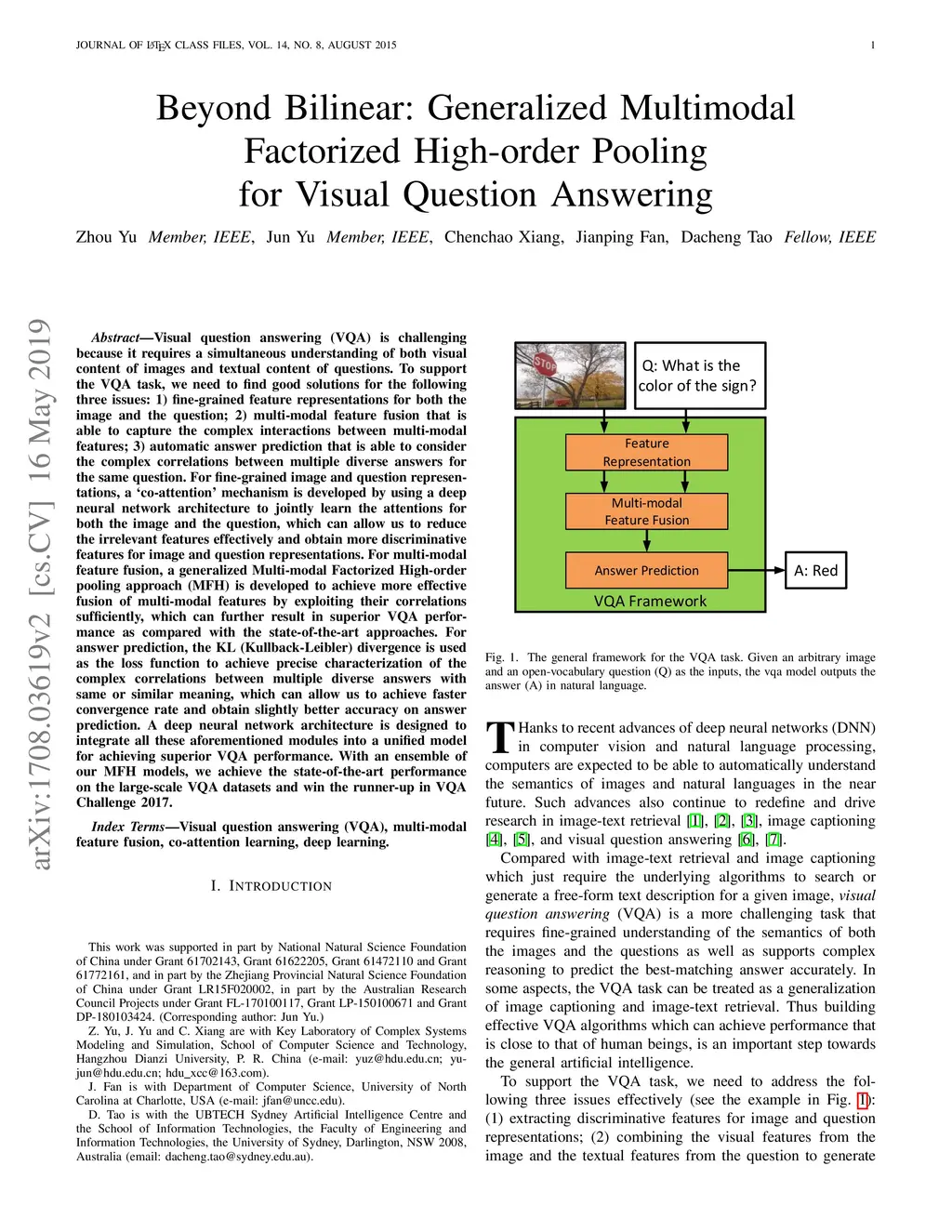 Visual question answering (VQA) is challenging because it requires a simultaneous understanding of both visual content of images and textual content of questions. To support the VQA task, we need to find good solutions for the following three issues: 1) fine-grained feature representations for both the image and the question; 2) multi-modal feature fusion that is able to capture the complex interactions between multi-modal features; 3) automatic answer prediction that is able to consider the complex correlations between multiple diverse answers for the same question. For fine-grained image and question representations, a `co-attention' mechanism is developed by using a deep neural network architecture to jointly learn the attentions for both the image and the question, which can allow us to reduce the irrelevant features effectively and obtain more discriminative features for image and question representations. For multi-modal feature fusion, a generalized Multi-modal Factorized High-order pooling approach (MFH) is developed to achieve more effective fusion of multi-modal features by exploiting their correlations sufficiently, which can further result in superior VQA performance as compared with the state-of-the-art approaches. For answer prediction, the KL (Kullback-Leibler) divergence is used as the loss function to achieve precise characterization of the complex correlations between multiple diverse answers with the same or similar meaning, which can allow us to achieve faster convergence rate and obtain slightly better accuracy on answer prediction. A deep neural network architecture is designed to integrate all these aforementioned modules into a unified model for achieving superior VQA performance. With an ensemble of our MFH models, we achieve the state-of-the-art performance on the large-scale VQA datasets and win the runner-up in VQA Challenge 2017.