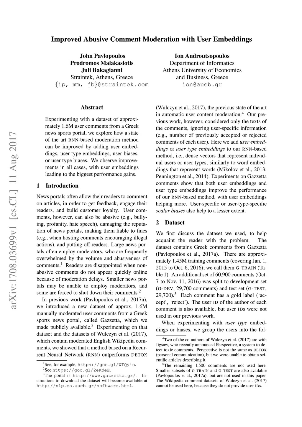 Experimenting with a dataset of approximately 1.6M user comments from a Greek news sports portal, we explore how a state of the art RNN-based moderation method can be improved by adding user embeddings, user type embeddings, user biases, or user type biases. We observe improvements in all cases, with user embeddings leading to the biggest performance gains.