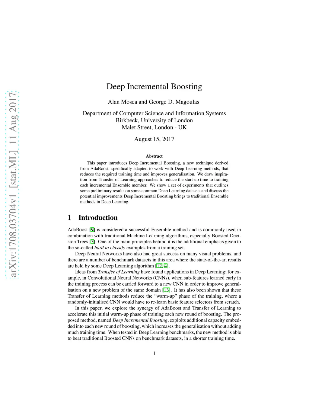 This paper introduces Deep Incremental Boosting, a new technique derived from AdaBoost, specifically adapted to work with Deep Learning methods, that reduces the required training time and improves generalisation. We draw inspiration from Transfer of Learning approaches to reduce the start-up time to training each incremental Ensemble member. We show a set of experiments that outlines some preliminary results on some common Deep Learning datasets and discuss the potential improvements Deep Incremental Boosting brings to traditional Ensemble methods in Deep Learning.