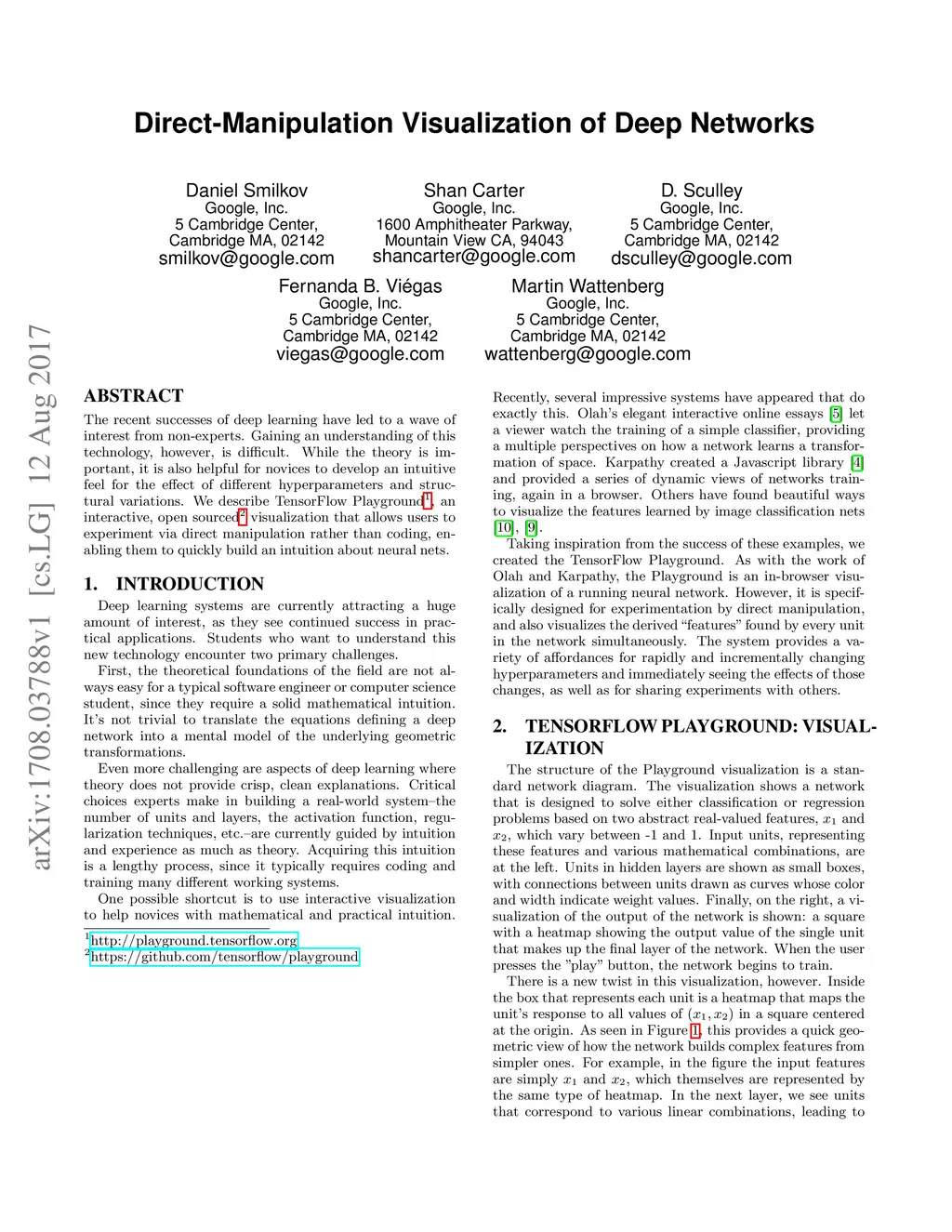 The recent successes of deep learning have led to a wave of interest from non-experts. Gaining an understanding of this technology, however, is difficult. While the theory is important, it is also helpful for novices to develop an intuitive feel for the effect of different hyperparameters and structural variations. We describe TensorFlow Playground, an interactive, open sourced visualization that allows users to experiment via direct manipulation rather than coding, enabling them to quickly build an intuition about neural nets.