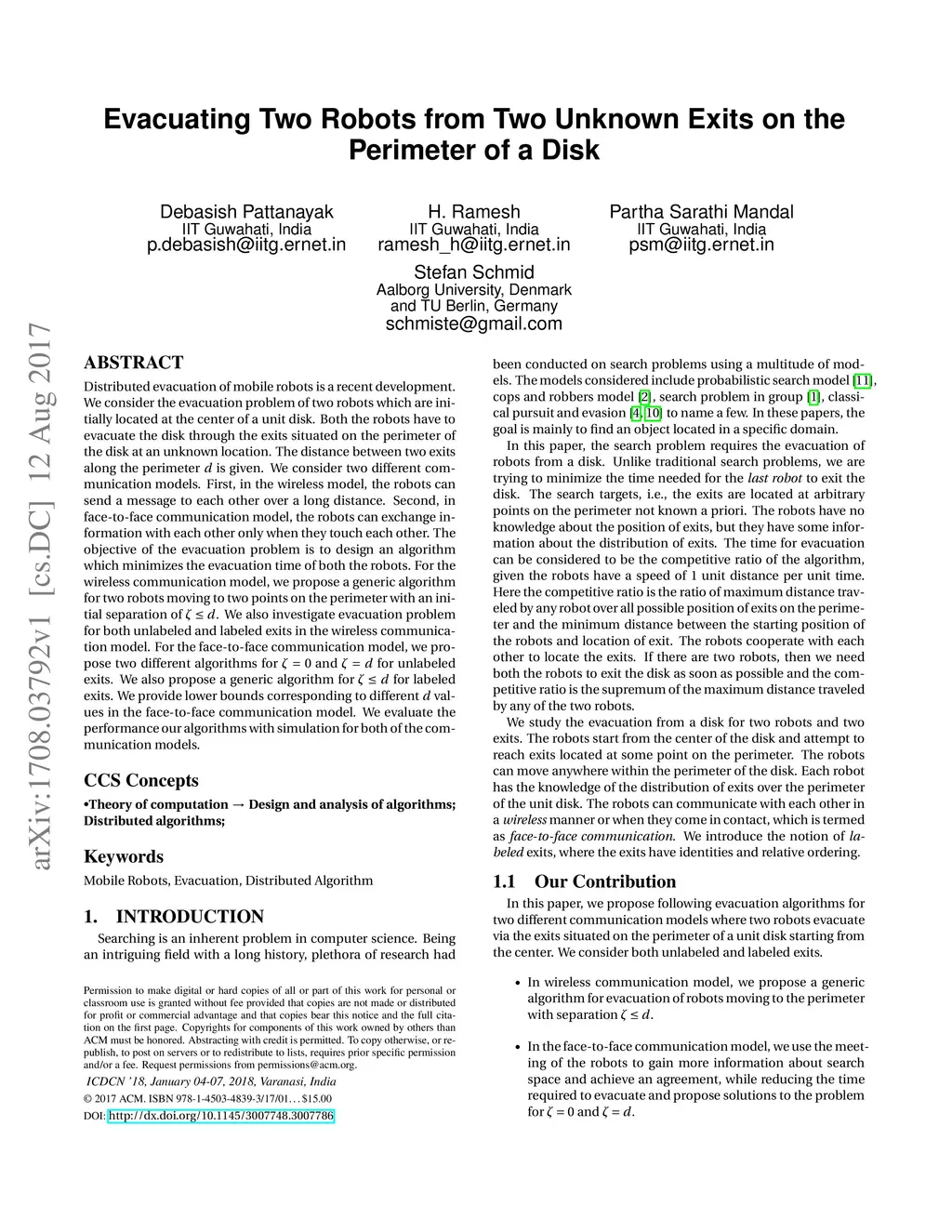 Distributed evacuation of mobile robots is a recent development. We consider the evacuation problem of two robots which are initially located at the center of a unit disk. Both the robots have to evacuate the disk through the exits situated on the perimeter of the disk at an unknown location. The distance between two exits along the perimeter is given. We consider two different communication models. First, in the wireless model, the robots can send a message to each other over a long distance. Second, in face-to-face communication model, the robots can exchange information with each other only when they touch each other. The objective of the evacuation problem is to design an algorithm which minimizes the evacuation time of both the robots. For the wireless communication model, we propose a generic algorithm for two robots moving to two points on the perimeter with an initial separation of . We also investigate evacuation problem for both unlabeled and labeled exits in the wireless communication model. For the face-to-face communication model, we propose two different algorithms for and for unlabeled exits. We also propose a generic algorithm for for labeled exits. We provide lower bounds corresponding to different values in the face-to-face communication model. We evaluate the performance our algorithms with simulation for both of the communication models.