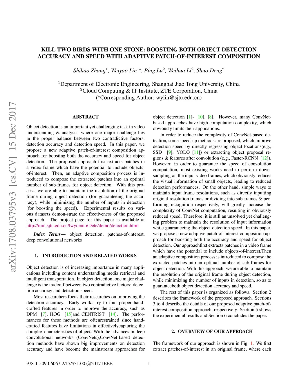 Object detection is an important yet challenging task in video understanding & analysis, where one major challenge lies in the proper balance between two contradictive factors: detection accuracy and detection speed. In this paper, we propose a new adaptive patch-of-interest composition approach for boosting both the accuracy and speed for object detection. The proposed approach first extracts patches in a video frame which have the potential to include objects-of-interest. Then, an adaptive composition process is introduced to compose the extracted patches into an optimal number of sub-frames for object detection. With this process, we are able to maintain the resolution of the original frame during object detection (for guaranteeing the accuracy), while minimizing the number of inputs in detection (for boosting the speed). Experimental results on various datasets demonstrate the effectiveness of the proposed approach.