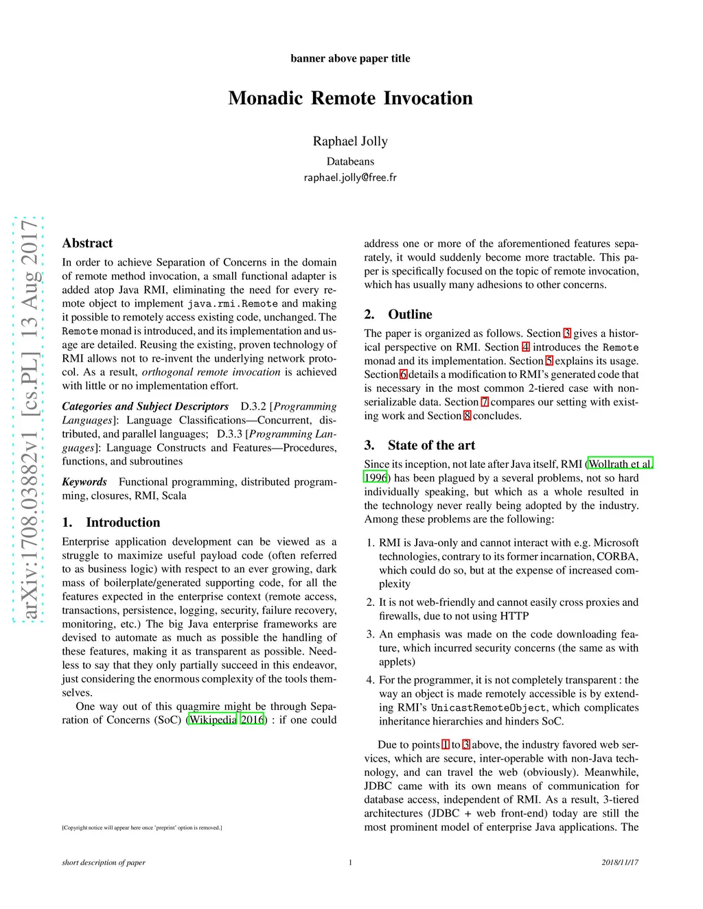 In order to achieve Separation of Concerns in the domain of remote method invocation, a small functional adapter is added atop Java RMI, eliminating the need for every remote object to implement java.rmi.Remote and making it possible to remotely access existing code, unchanged. The Remote monad is introduced, and its implementation and usage are detailed. Reusing the existing, proven technology of RMI allows not to re-invent the underlying network protocol. As a result, orthogonal remote invocation is achieved with little or no implementation effort.