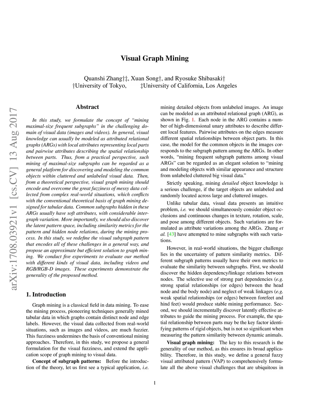 In this study, we formulate the concept of "mining maximal-size frequent subgraphs" in the challenging domain of visual data (images and videos). In general, visual knowledge can usually be modeled as attributed relational graphs (ARGs) with local attributes representing local parts and pairwise attributes describing the spatial relationship between parts. Thus, from a practical perspective, such mining of maximal-size subgraphs can be regarded as a general platform for discovering and modeling the common objects within cluttered and unlabeled visual data. Then, from a theoretical perspective, visual graph mining should encode and overcome the great fuzziness of messy data collected from complex real-world situations, which conflicts with the conventional theoretical basis of graph mining designed for tabular data. Common subgraphs hidden in these ARGs usually have soft attributes, with considerable inter-graph variation. More importantly, we should also discover the latent pattern space, including similarity metrics for the pattern and hidden node relations, during the mining process. In this study, we redefine the visual subgraph pattern that encodes all of these challenges in a general way, and propose an approximate but efficient solution to graph mining. We conduct five experiments to evaluate our method with different kinds of visual data, including videos and RGB/RGB-D images. These experiments demonstrate the generality of the proposed method.